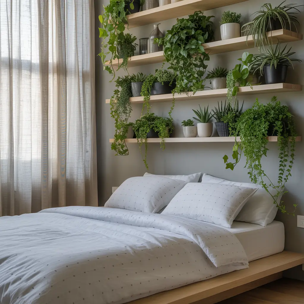 Plant shelves above the bed create this amazing natural canopy effect. My bedroom features a long floating shelf filled with trailing plants that create a gorgeous green backdrop.