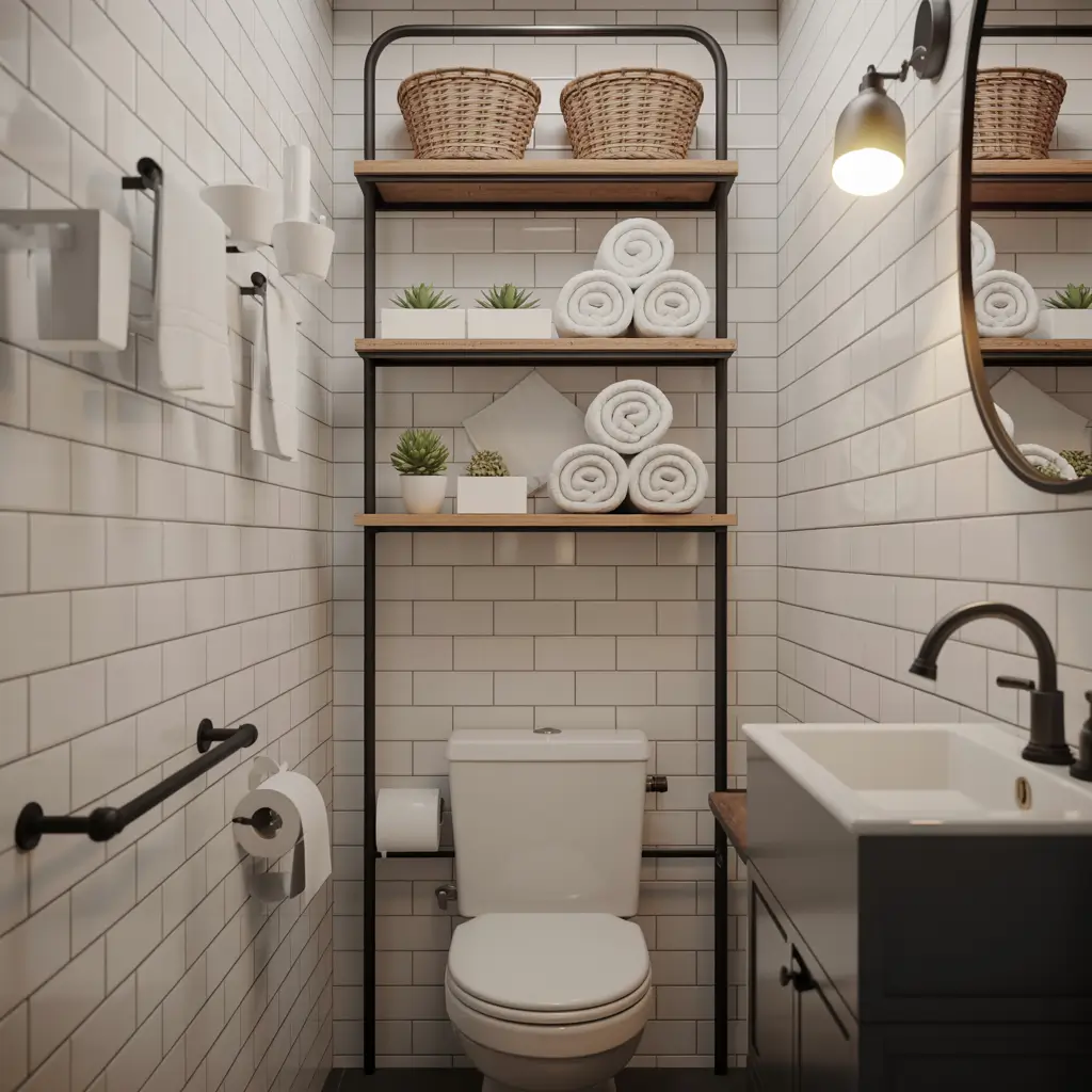 Black metal shelving brings that urban loft aesthetic to your bathroom, even if you’re in suburban anywhere. My powder room features a matte black frame unit that makes the space look intentionally designed rather than just functional.
