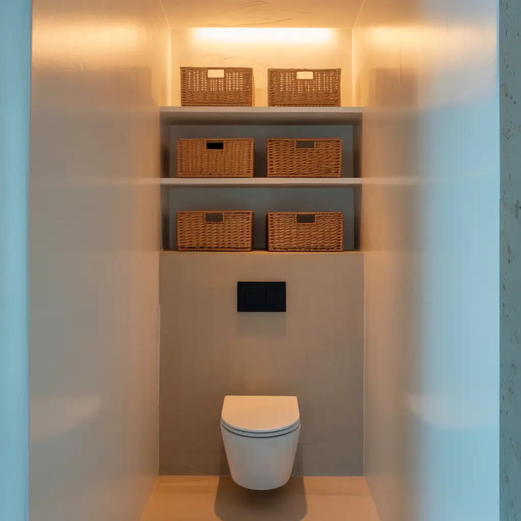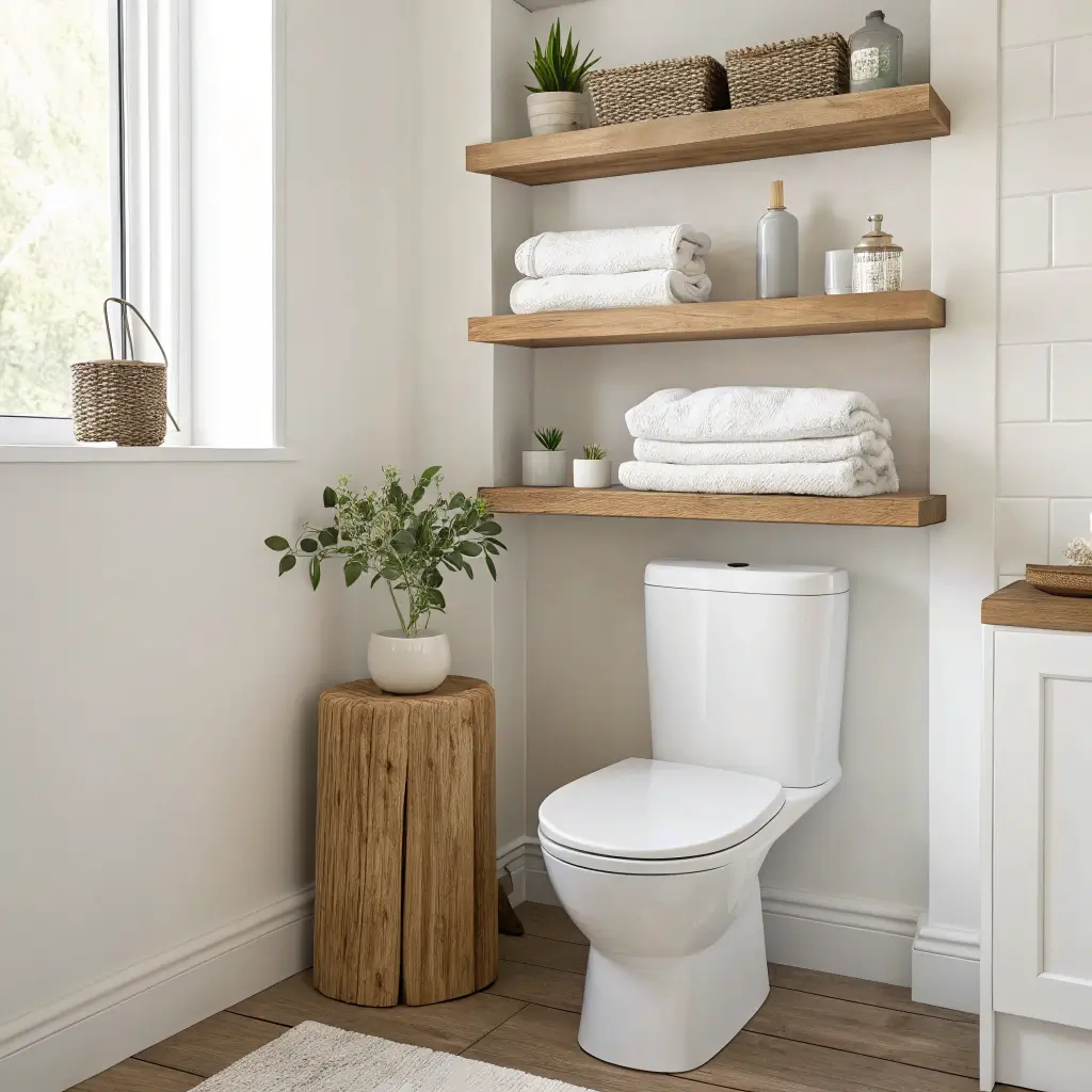 Built-in shelves turn that awkward toilet alcove into an architectural feature. During my bathroom renovation, I added three recessed shelves above the toilet, and they make the space look custom-designed rather than builder basic.