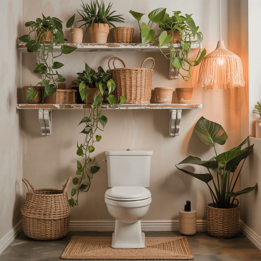 Whether you go minimal with floating shelves or create a full jungle with plant-filled boho shelves, the right storage solution can transform this overlooked space into both functional storage and a design feature.