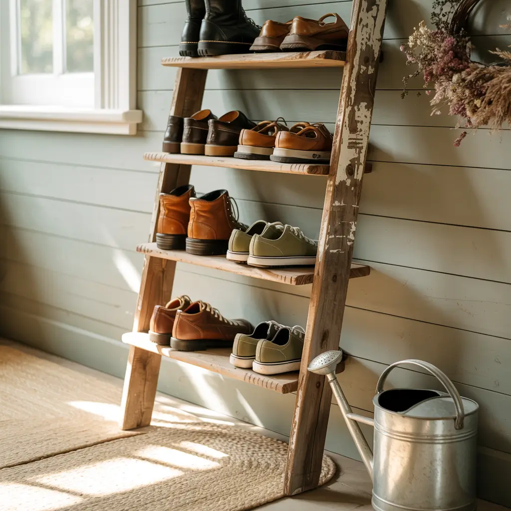 A rustic ladder shelf brings farmhouse charm while storing your shoes vertically. My mudroom features a reclaimed wood ladder that holds everything from winter boots to summer sandals, and it looks like it belongs in a high-end country store.