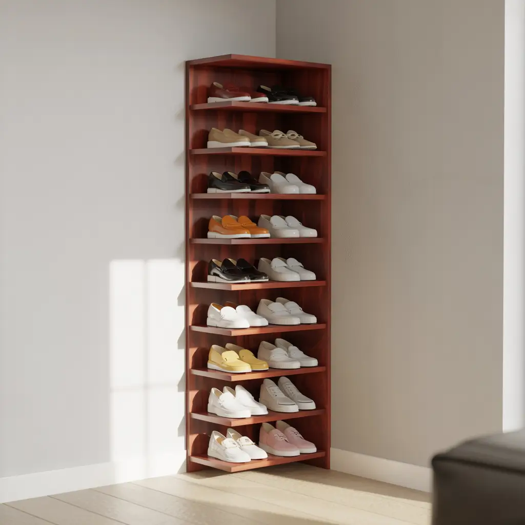 The vertical design maximizes storage while the corner placement keeps shoes accessible but out of the way.