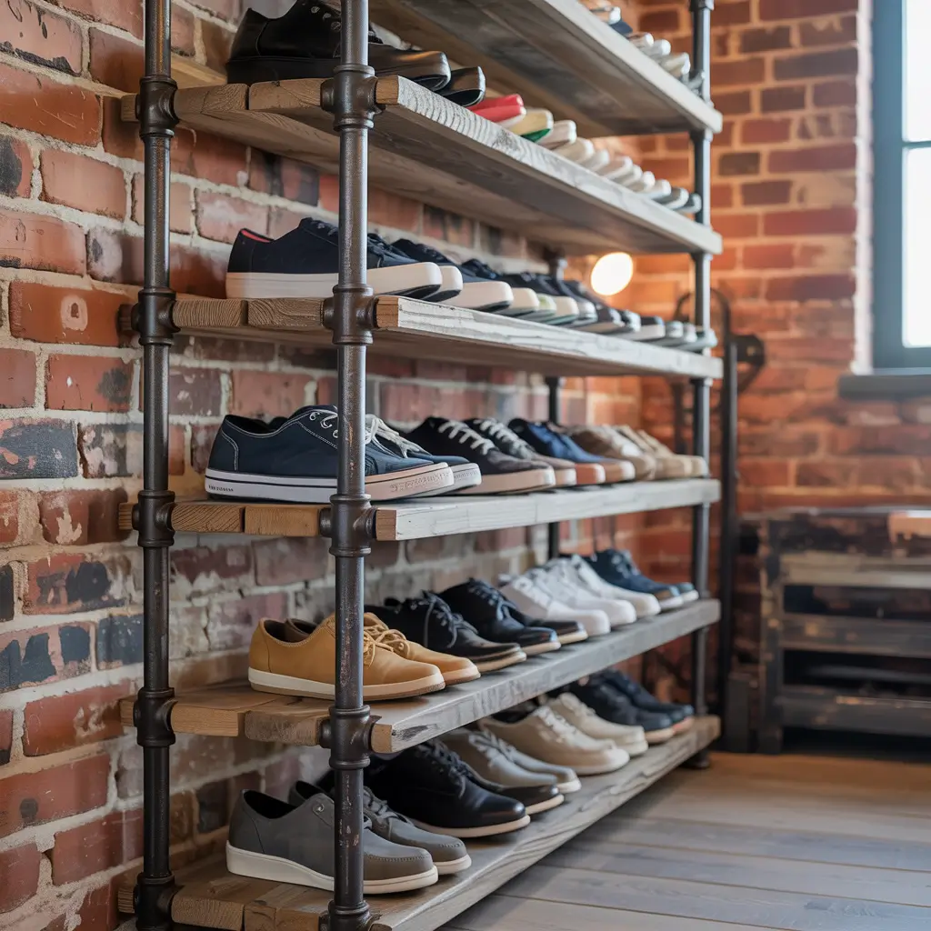 Industrial pipe racks bring that Brooklyn loft vibe to shoe storage. My entryway features black iron pipes with wooden shelves that make even my running shoes look sophisticated.
