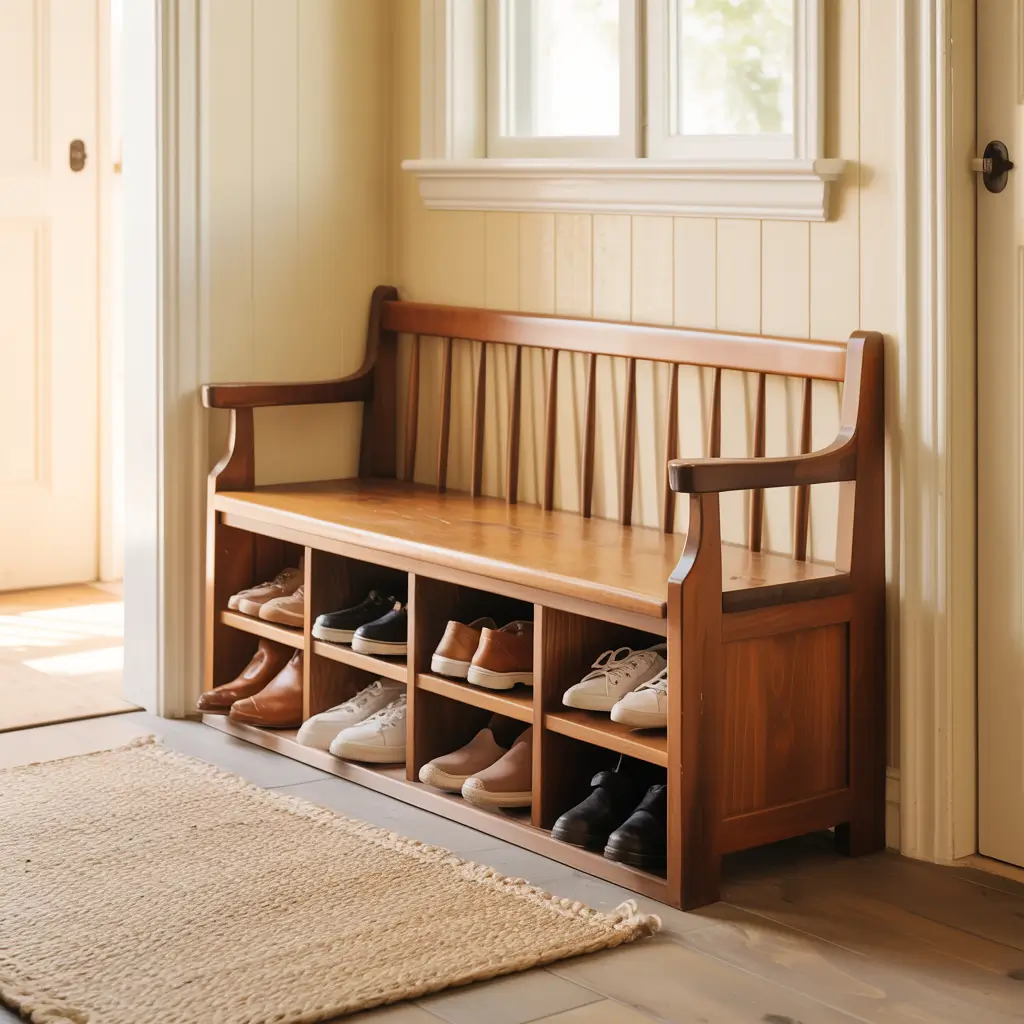 Under-bench storage combines seating with shoe organization. My entryway bench provides comfortable seating for shoe changes while hiding my everyday footwear underneath.