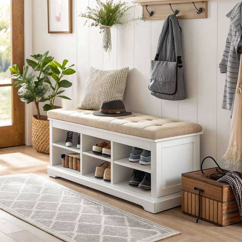 Hidden shoe storage benches solve two problems simultaneously — you need seating to put on shoes, and you need somewhere to store them. This dual-purpose furniture basically pays rent twice.