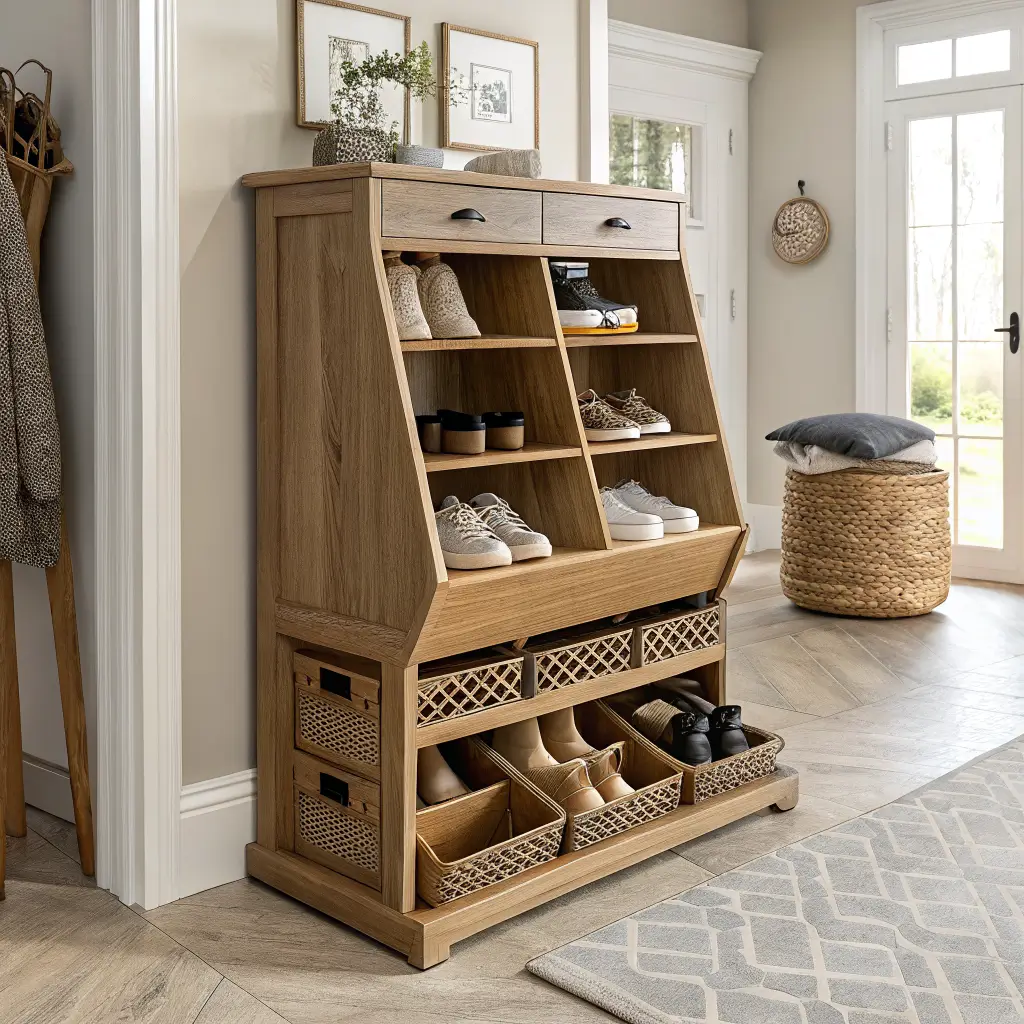 Wooden multi-tier cabinets work because they elevate shoe storage from utilitarian to decorative. Your entryway looks furnished and intentional rather than just… storing stuff.
