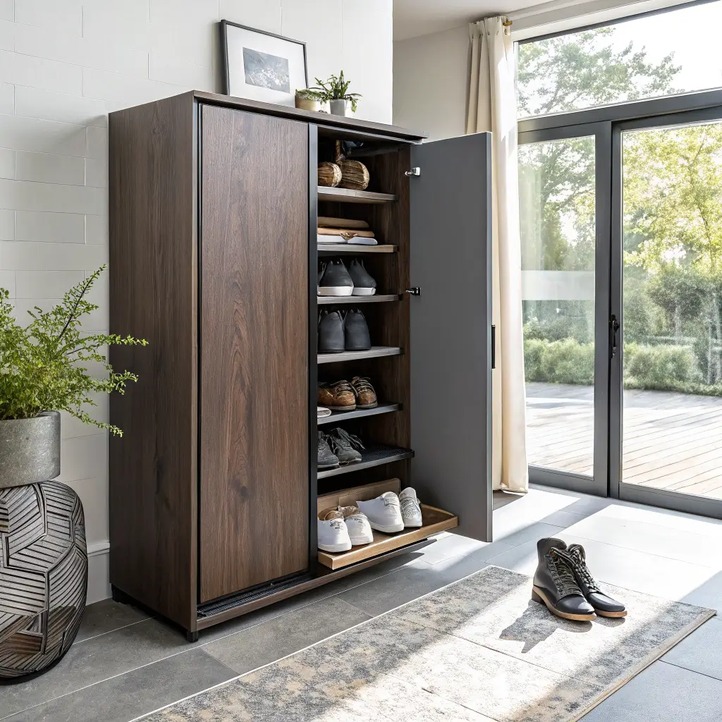 Pull-out shoe cabinets with sliding mechanisms pack incredible storage into shallow spaces. These clever designs maximize capacity while maintaining a slim profile when closed.