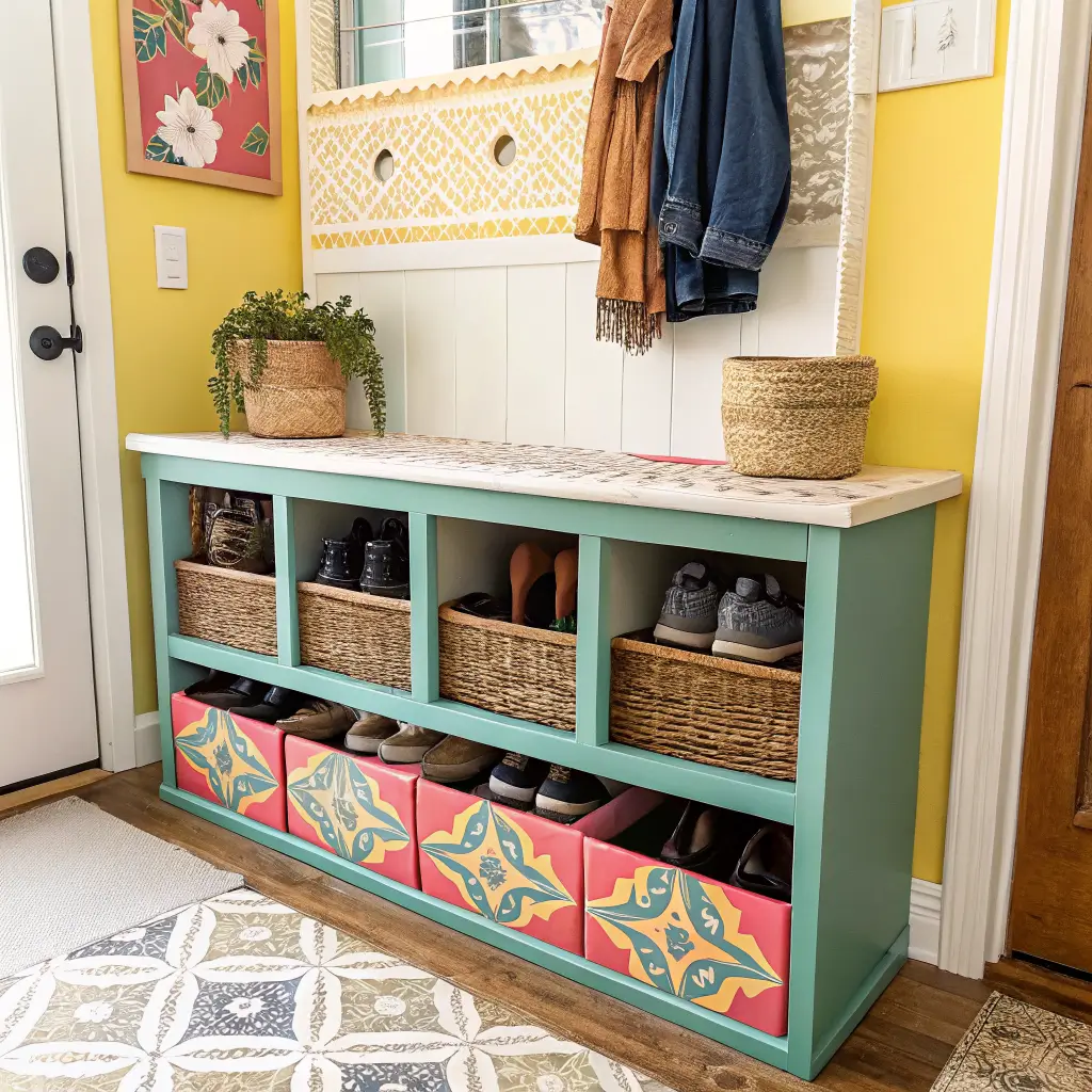 9. DIY Painted Shoe Cabinet with Storage Baskets