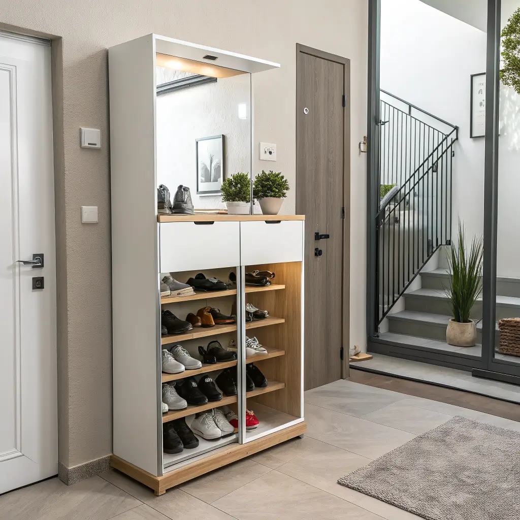 My mirrored shoe cabinet literally doubled the visual size of my tiny entryway. The reflection creates depth that doesn’t actually exist, while the mirror functionality means I check my appearance right where I put on my shoes.