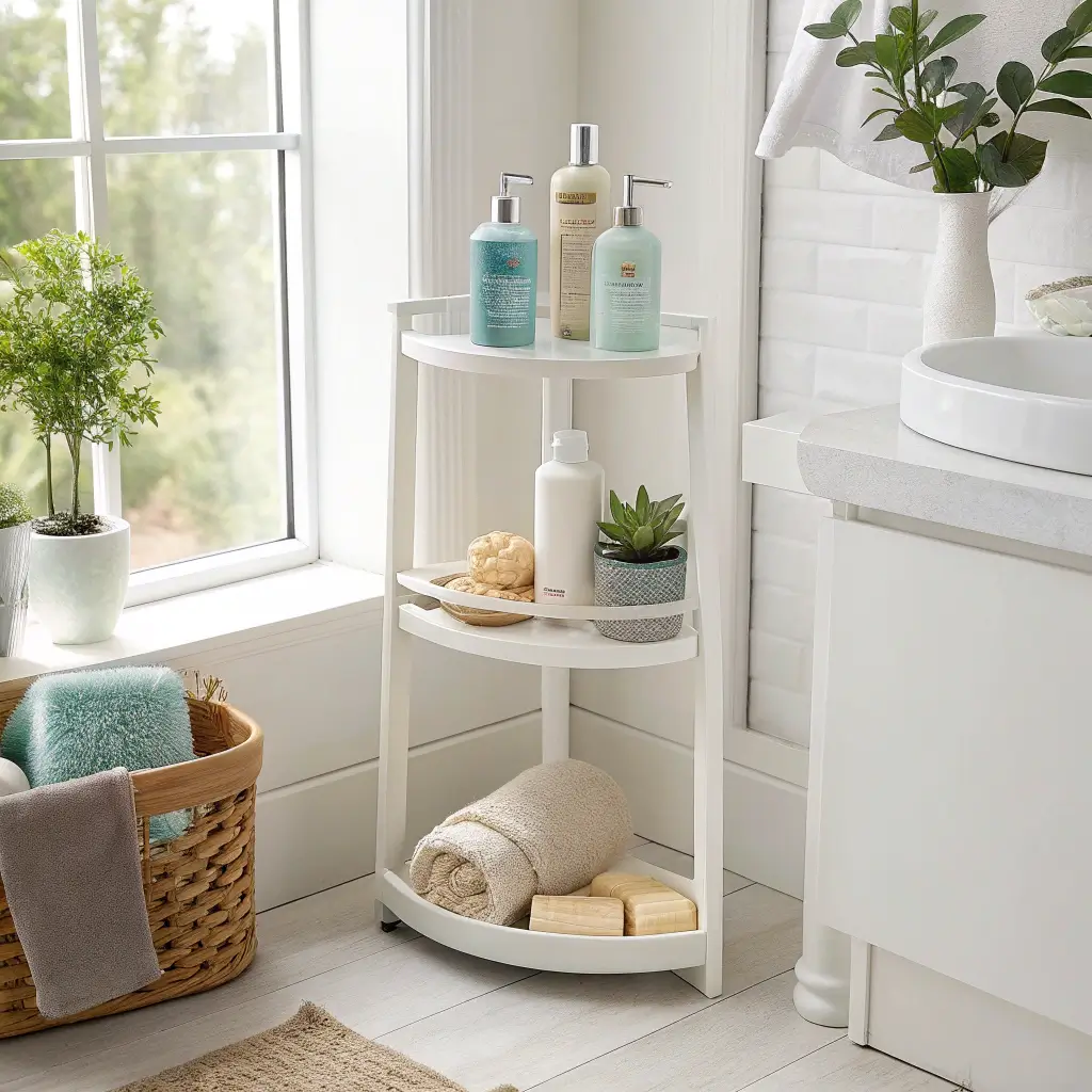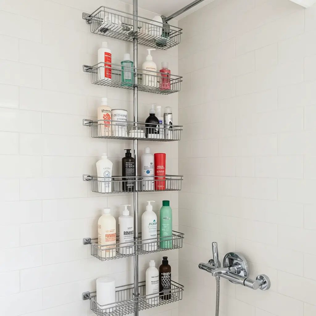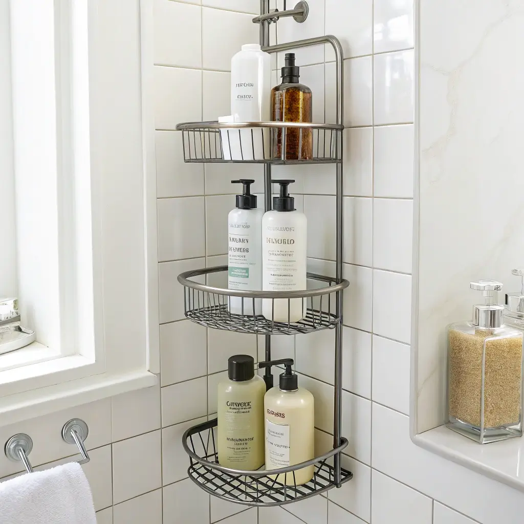Tiered corner stands maximize vertical space from floor to ceiling. My five-tier corner unit turned a useless corner into the command center of shower organization. Each tier serves a different purpose, creating zones that make sense for daily routines.