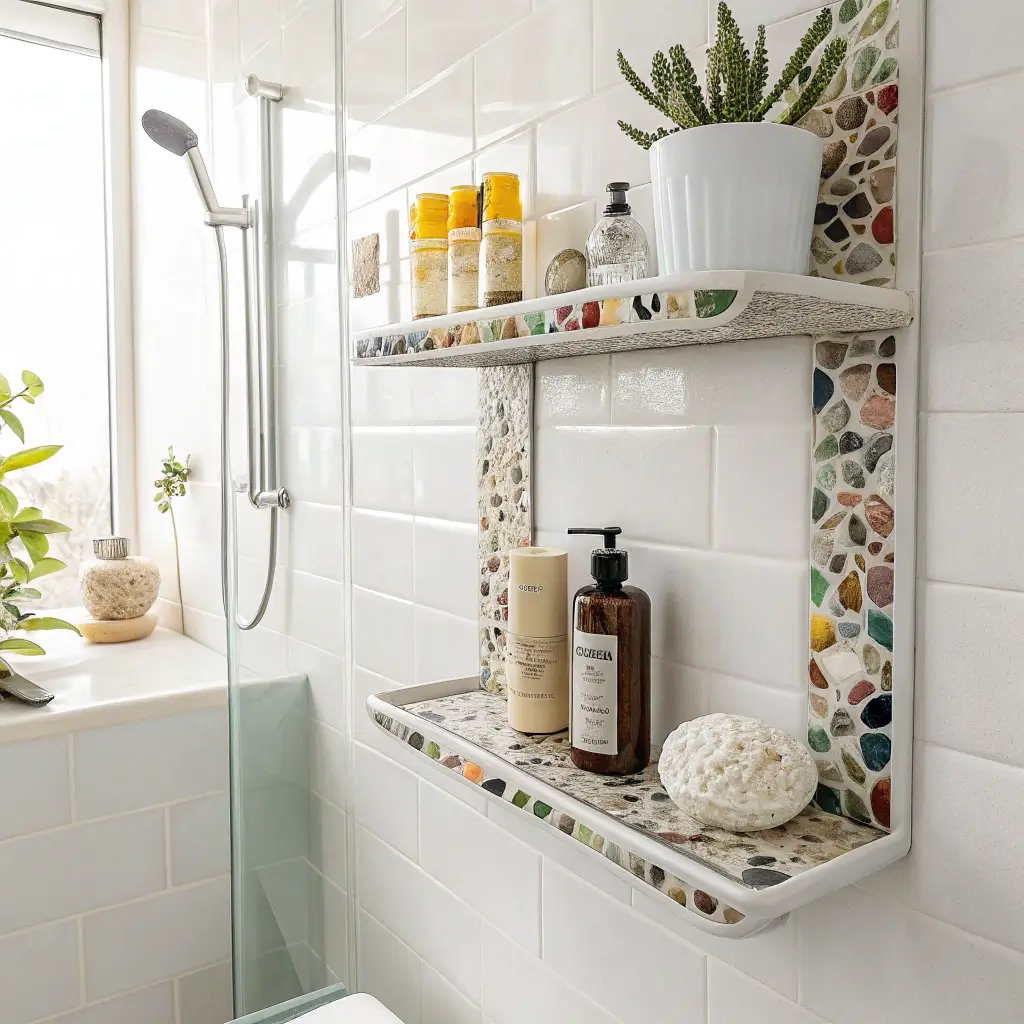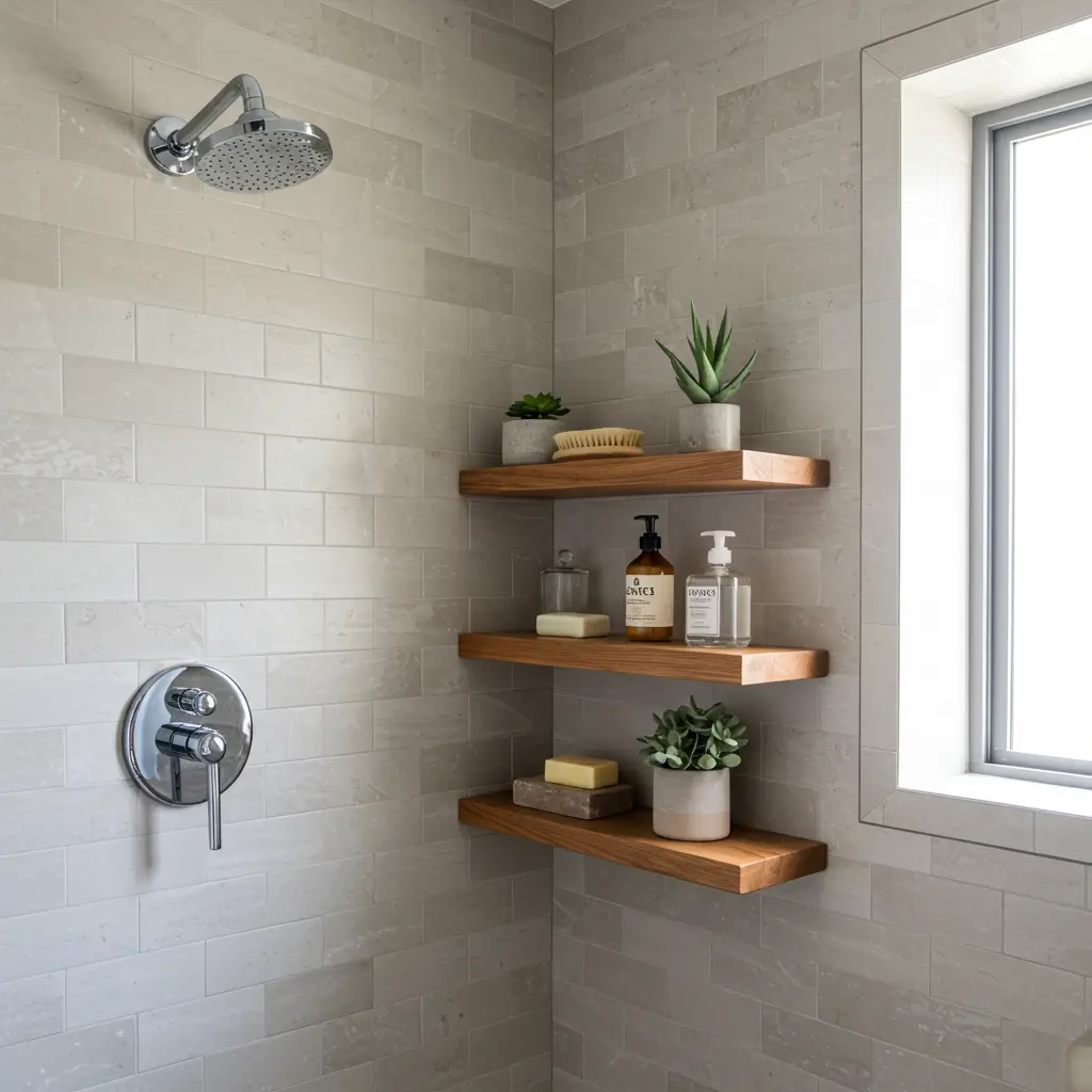 Waterproof wooden shelves bring warmth to cold shower spaces while defying everything wood shouldn’t do – namely, get wet constantly. My teak floating shelf has survived two years of daily showers and still looks stunning. The wood adds a spa-like quality that plastic never could achieve.