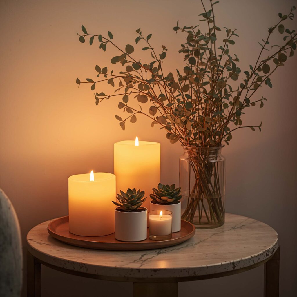 Here’s my go-to formula: pair a statement candle (I’m talking about those fancy ones with wooden wicks that crackle) with a small potted plant. The contrast between the organic greenery and the warm glow of candlelight? Chef’s kiss.