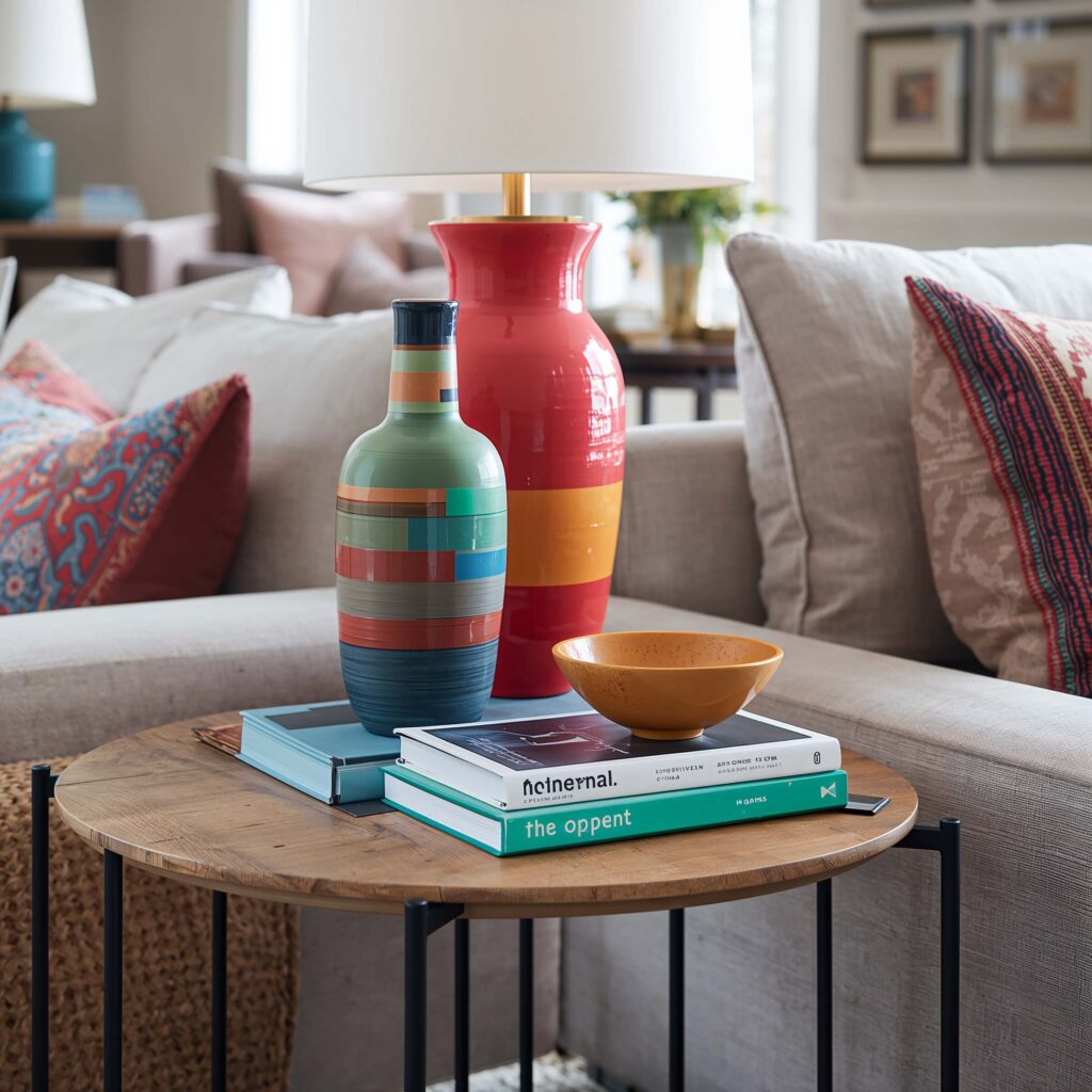 Pick one bold color – I’m partial to emerald green or deep coral – and use it as your star player. Maybe it’s a bright ceramic vase, a colorful art piece, or even a stack of books in that shade. The rest of your accessories should be neutral to let that color really sing.