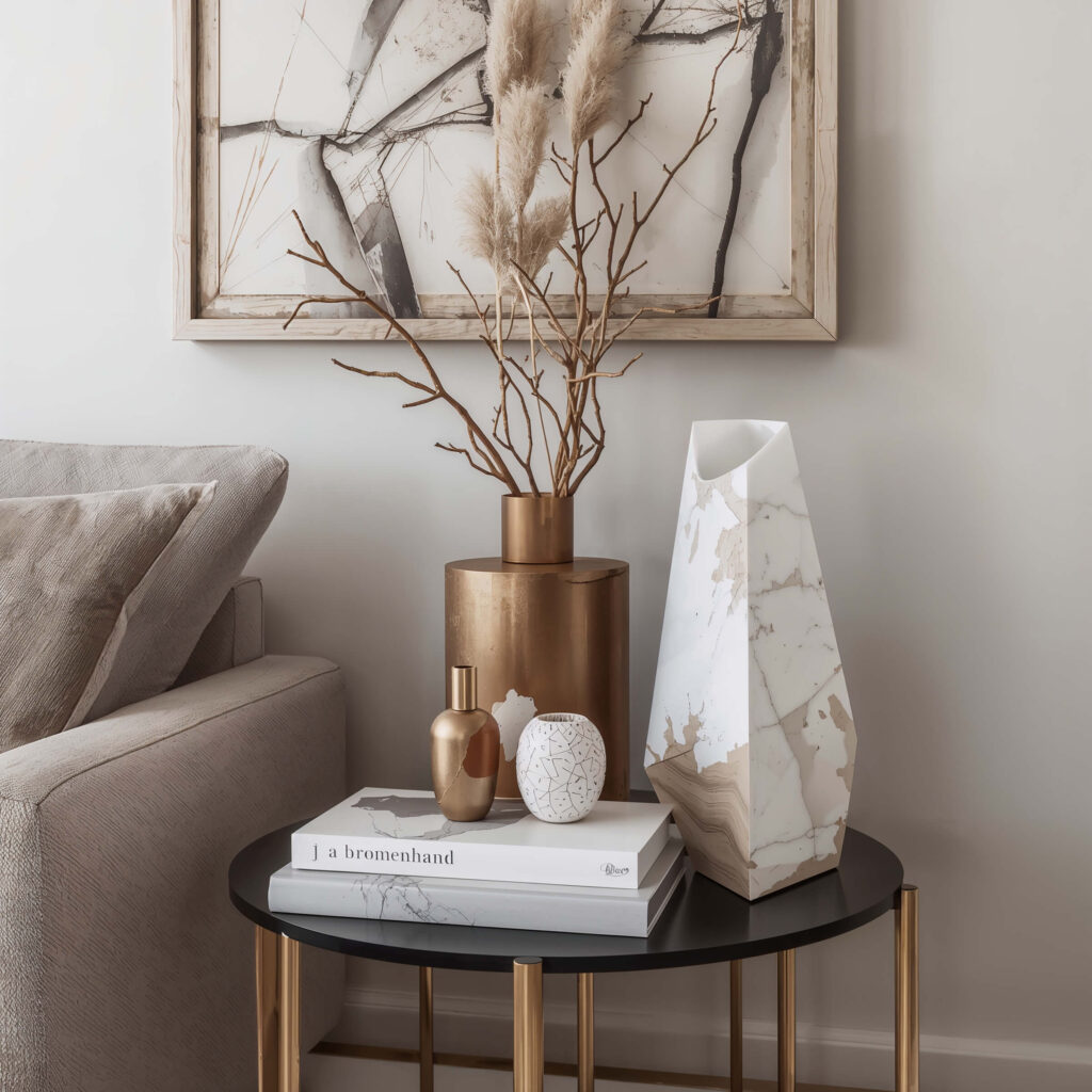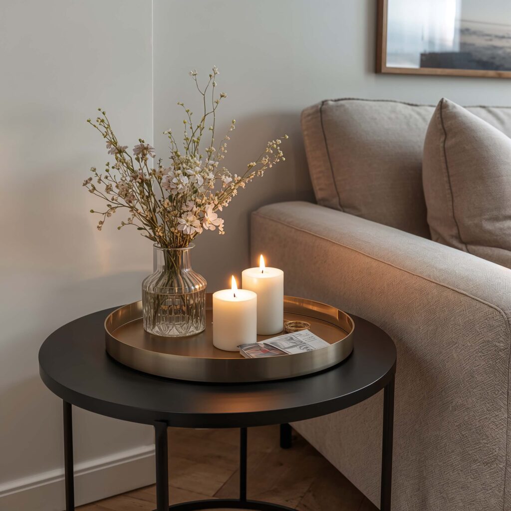 Trays are the secret weapon of side table styling. They create boundaries, add layers, and make everything look intentional – even if you just threw it together five minutes ago.