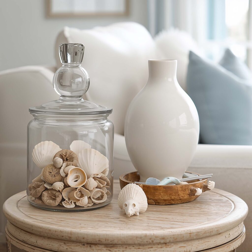 I love using a piece of coral or a beautiful shell as a sculptural element, paired with a white ceramic lamp and maybe a small succulent in a textured pot. Add a coffee table book about sailing or coastal living, and you’ve nailed the look without going overboard (pun intended).