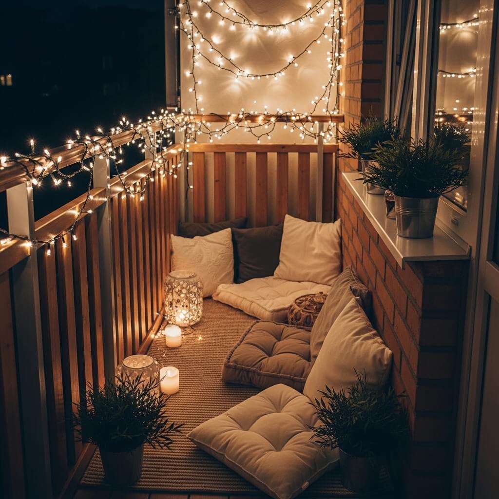 I resisted them for the longest time because I thought they’d look cheesy, but one evening I strung up a single strand of warm white LED string lights, and suddenly my balcony transformed from “meh” to “wow, I actually want to hang out here.”