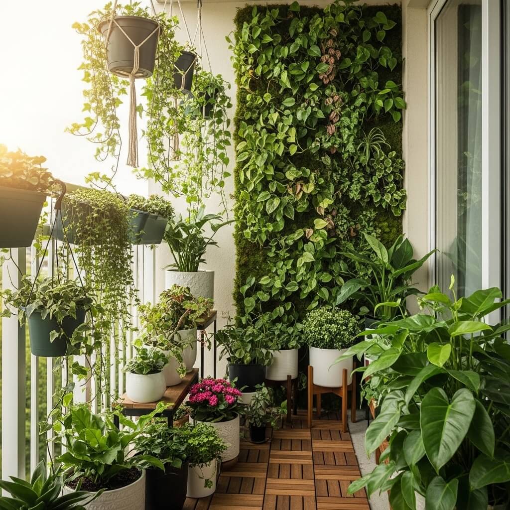 Choose plants that actually match your balcony’s sun exposure. I made the rookie mistake of buying sun-loving herbs for my north-facing balcony, and they basically gave up on life within a month. Now I stick with shade-tolerant plants like ferns, pothos, and snake plants, and surprise—they’re thriving!