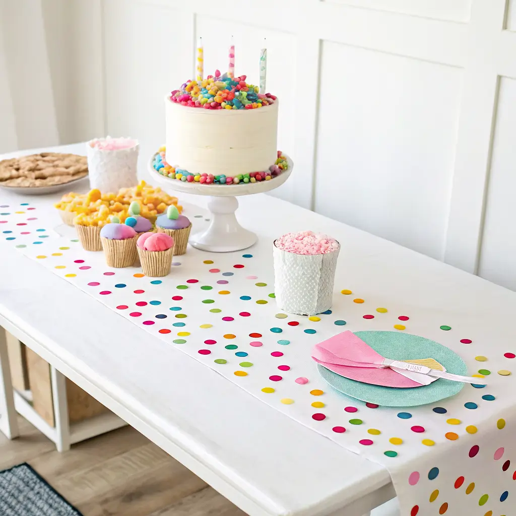 A table often acts as the visual center of a birthday setup. If it looks flat, the whole party can feel flat. A confetti runner adds color and texture in one move.