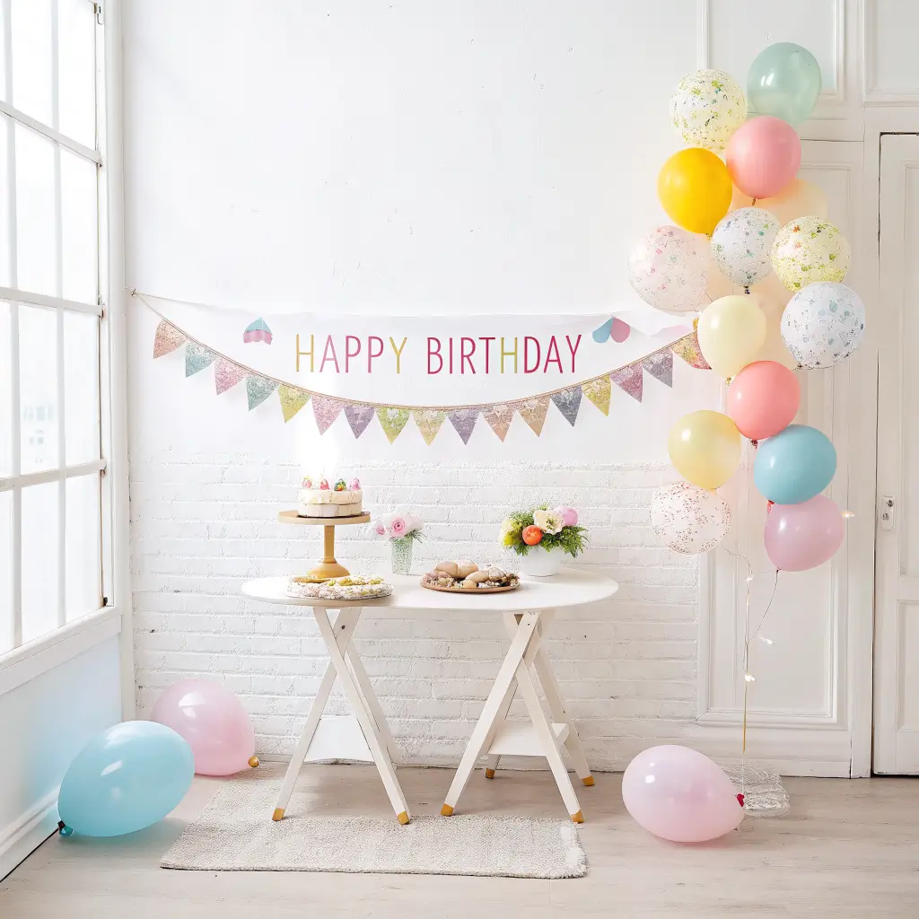 If you remember anything from this guide, remember this: choose a color palette, decorate your main focal points, and keep your setup intentional. A minimal balloon garland, pastel lanterns, flowers, coordinated tableware, a personalized banner, and a cozy photo corner can do a lot more than a pile of random supplies ever will.