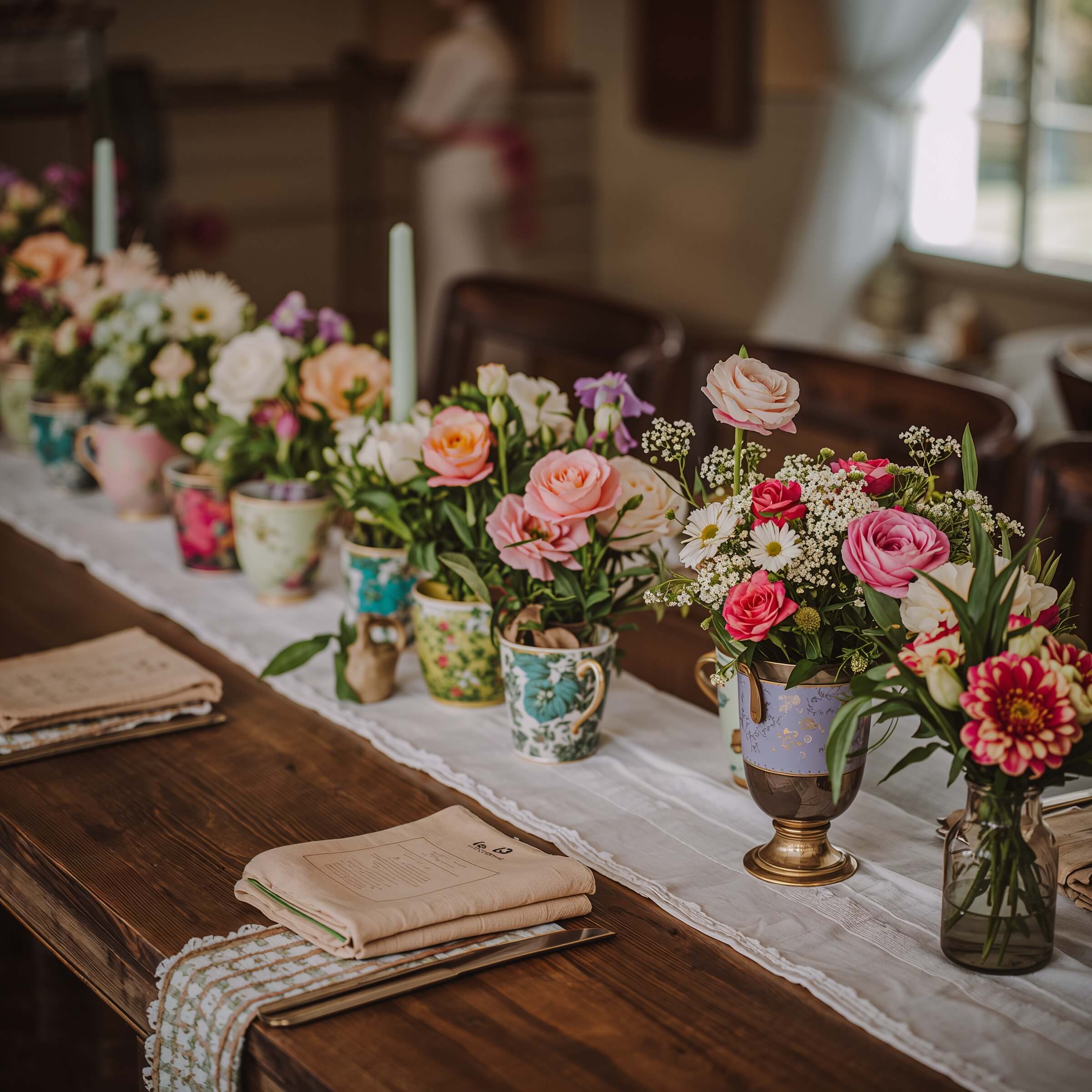 Group cups in odd numbers – three or five per table works beautifully. Place them on vintage doilies or old books for added height and interest. This creates little vignettes that guests can admire without blocking conversation.