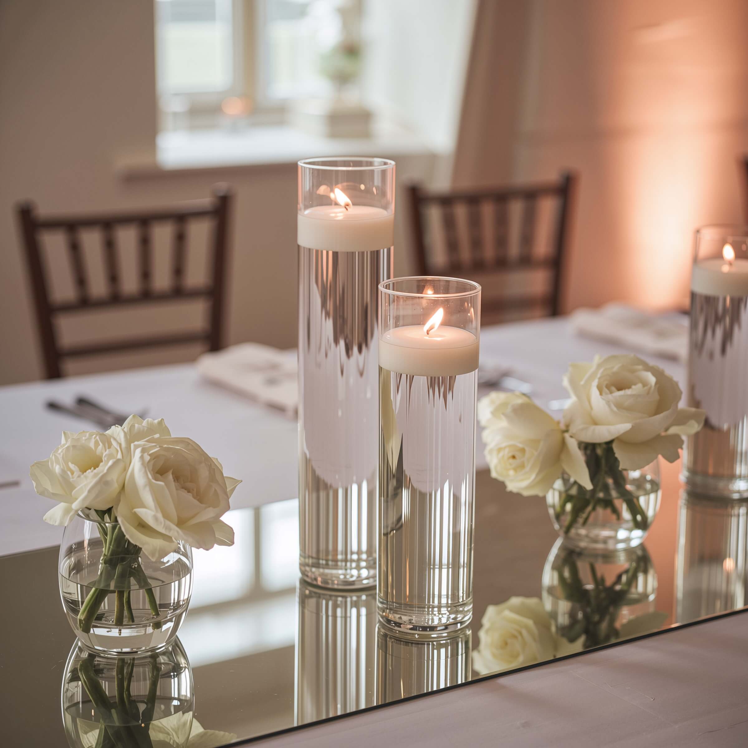Sometimes simple really does it best. Clear glass vases filled with water and floating candles create an ethereal glow that transforms any space into a romantic wonderland.
