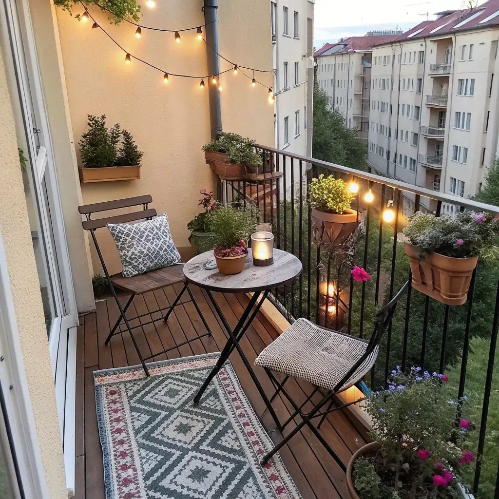 String lights and a small rug instantly made it feel intentional rather than forgotten. Add a folding chair and a tiny table, and suddenly you’re living that European café lifestyle (sort of).