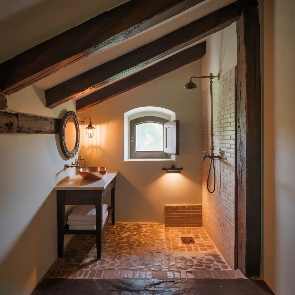 The key to rustic beam bathrooms? Don’t overdo the cabin vibes unless you want to feel like you’re showering in a Lincoln Log house. Mix rustic elements with contemporary touches – vintage wood with modern tiles, exposed beams with minimalist fixtures.