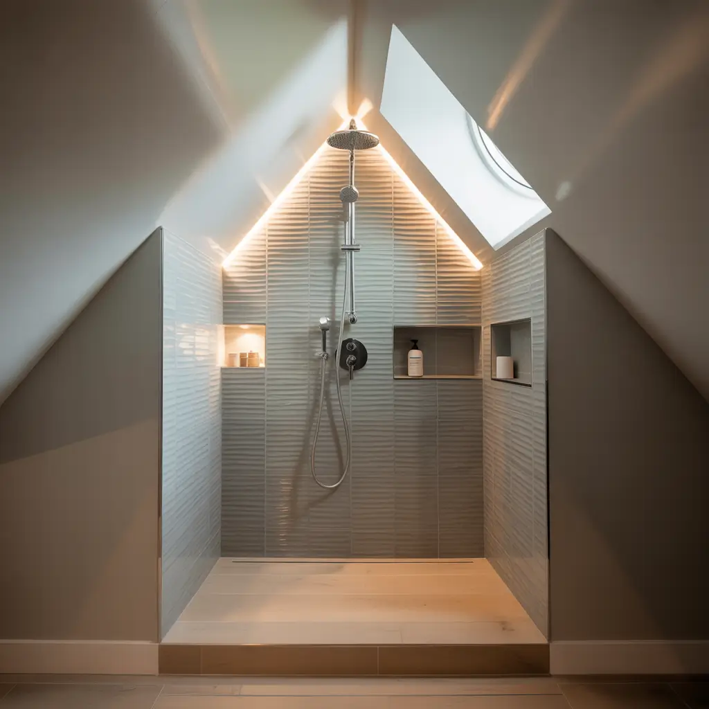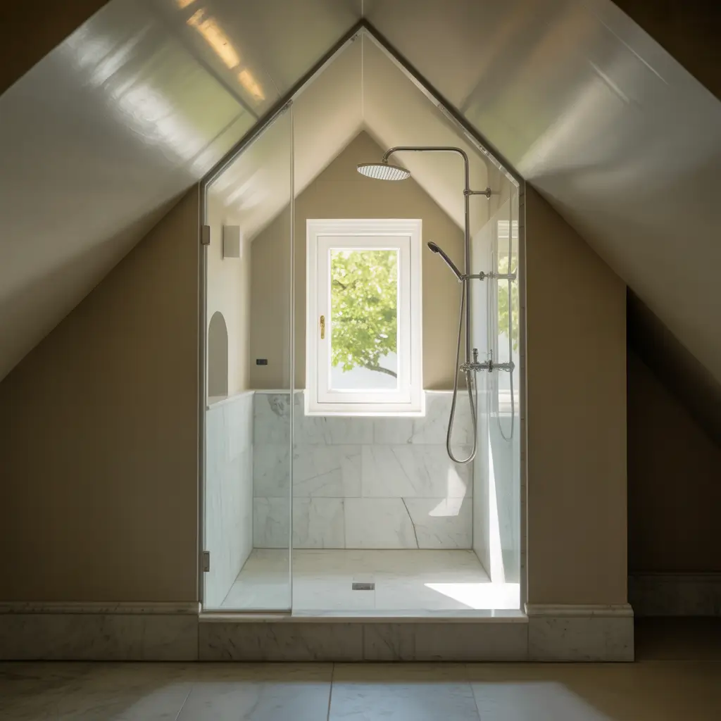 Corner placement also improves bathroom flow. Tucking the shower into the lowest corner leaves the higher areas for moving around comfortably. Add a linear drain along the lowest edge for proper water management. Nobody wants attic ceiling leaks – trust me.