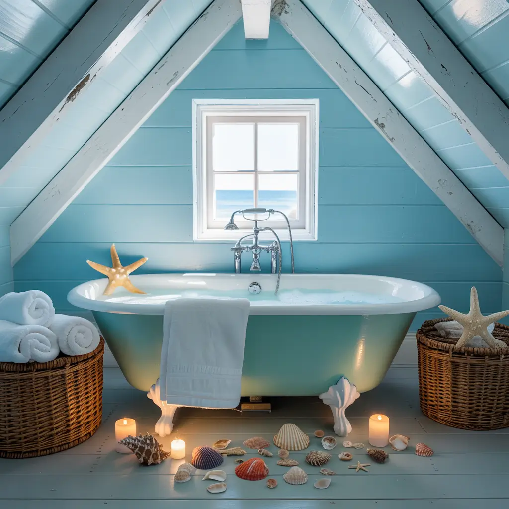 Coastal vibes in the attic create the ultimate escape room. Soft blues, whites, and natural textures transport you to the beach without the sand in uncomfortable places. My beach-obsessed mom turned her attic into a coastal paradise that feels like permanent vacation.