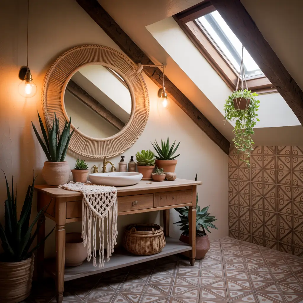Bohemian style in attic bathrooms creates eclectic sanctuaries that celebrate imperfection. Those quirky angles and odd spaces? Perfect for boho’s anything-goes aesthetic. My friend’s attic bathroom looks like a Moroccan riad met a vintage shop and had a beautiful baby.