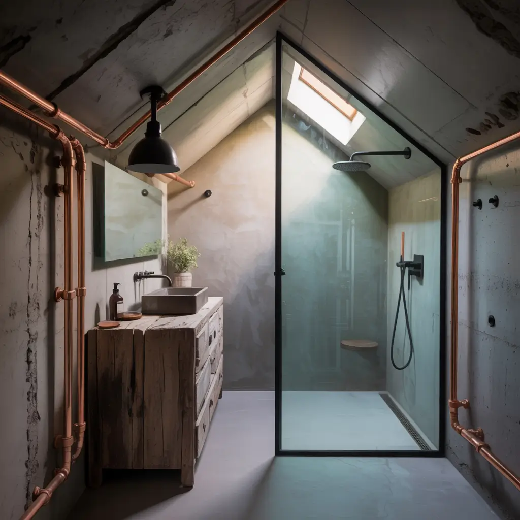 The exposed pipe trend works especially well in attics where hiding plumbing proves challenging. Instead of boxing everything in, he made copper pipes part of the design. Combined with concrete-look tiles and matte black fixtures, it’s intentionally unfinished in the best way.
