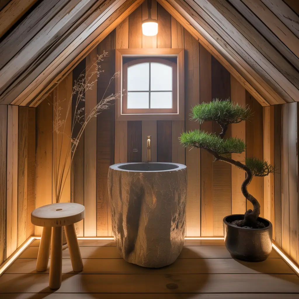 Keep the design simple and intentional. A wooden soaking tub, stone sink, and minimal decorations let natural materials shine. Add a small fountain for sound therapy and some air-purifying plants. It’s basically a wellness center that happens to have a toilet :/