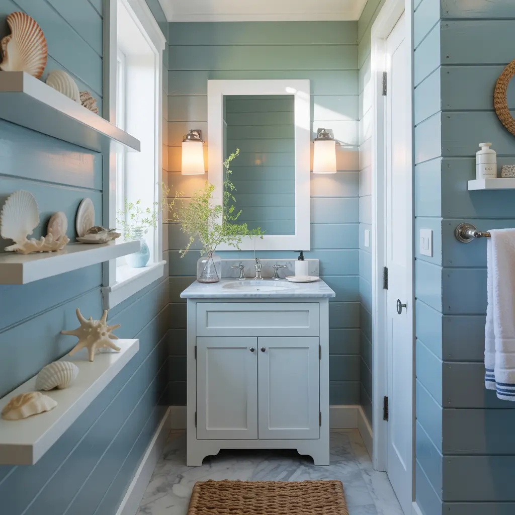 The sweet spot for small bathrooms sits somewhere between powder blue and ocean blue. Too light and it reads baby nursery. Too dark and we’re back in cave territory. You want that perfect middle ground that whispers “beach house” without screaming “Finding Nemo.”