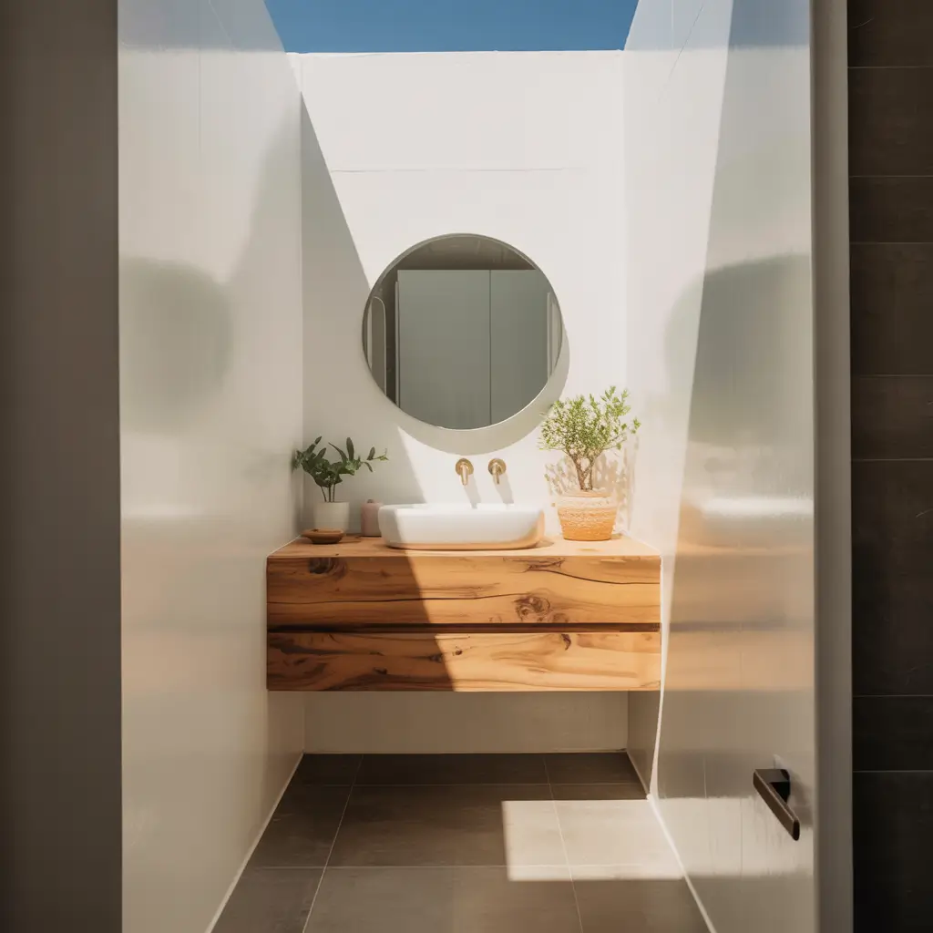 Natural wood in bathrooms isn’t just trendy – it’s smart design for small spaces. Wood adds warmth without visual weight, making your bathroom feel cozy rather than cramped.