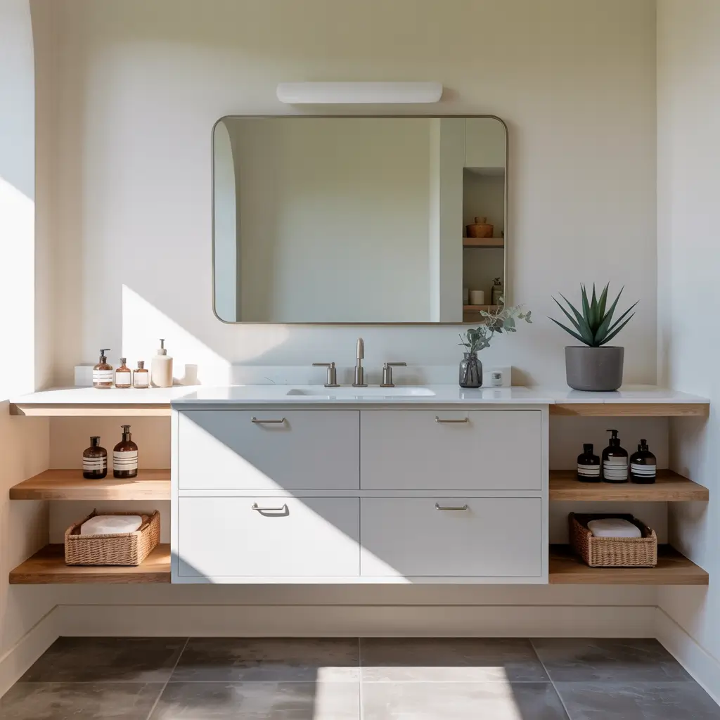 Think beyond basic medicine cabinets. Modern wall storage can actually enhance your bathroom’s style: