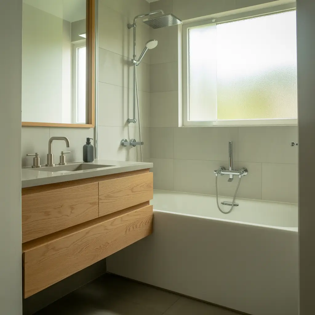 My brightest bathroom success came from removing unnecessary visual barriers. Instead of boxing in the tub with walls or curtains, I used a half-wall with glass above. Combined with light colors and minimal fixtures, the tub area felt integrated into the room rather than crammed into a corner. The openness made everything feel larger.