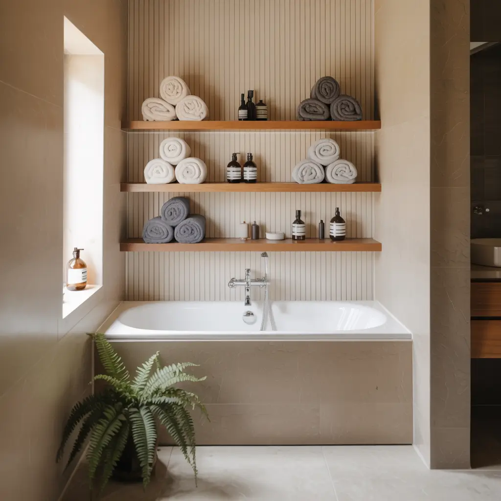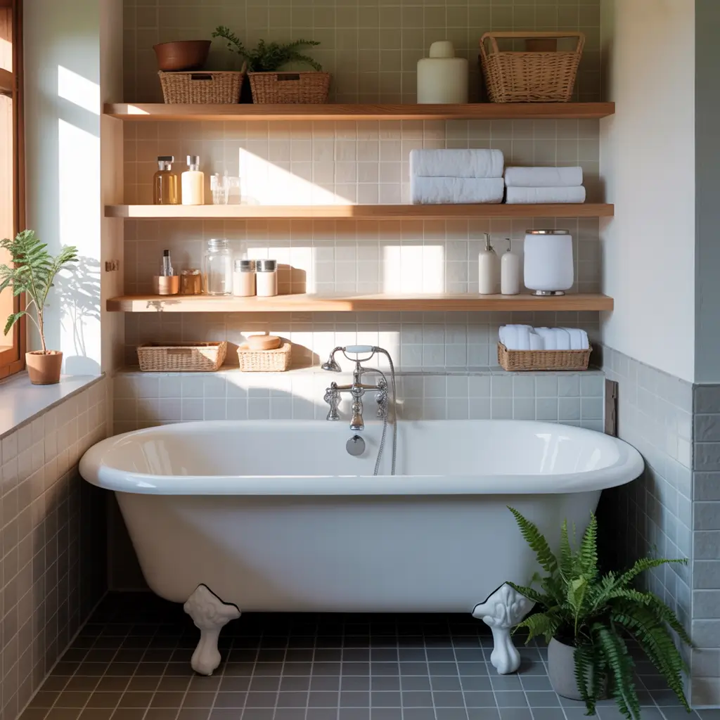 Vertical storage solutions around tubs maximize space without crowding the floor. This approach uses wall space efficiently while keeping bath essentials within reach.