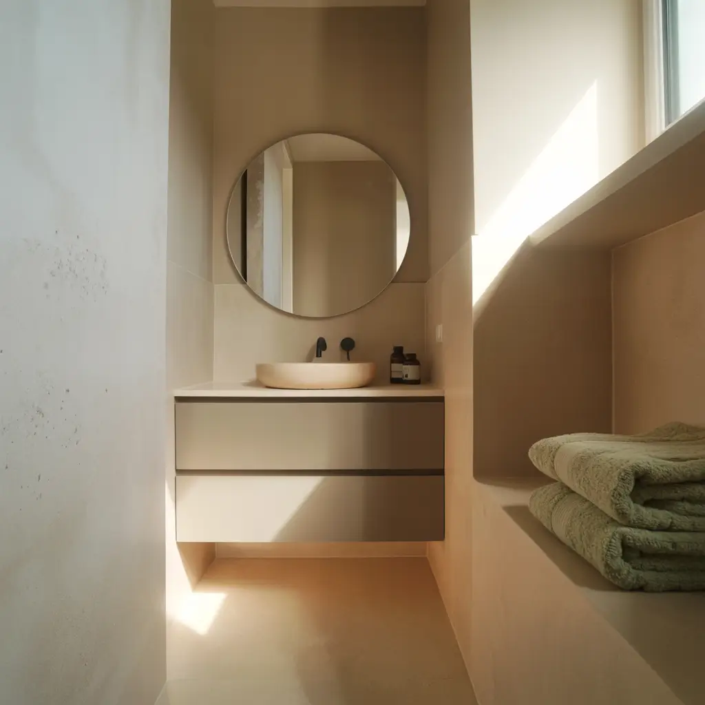 Whites, beiges, soft grays, and warm taupes create a seamless flow that makes walls seem to recede. The bathroom feels airy and spacious rather than closed-in and cramped.