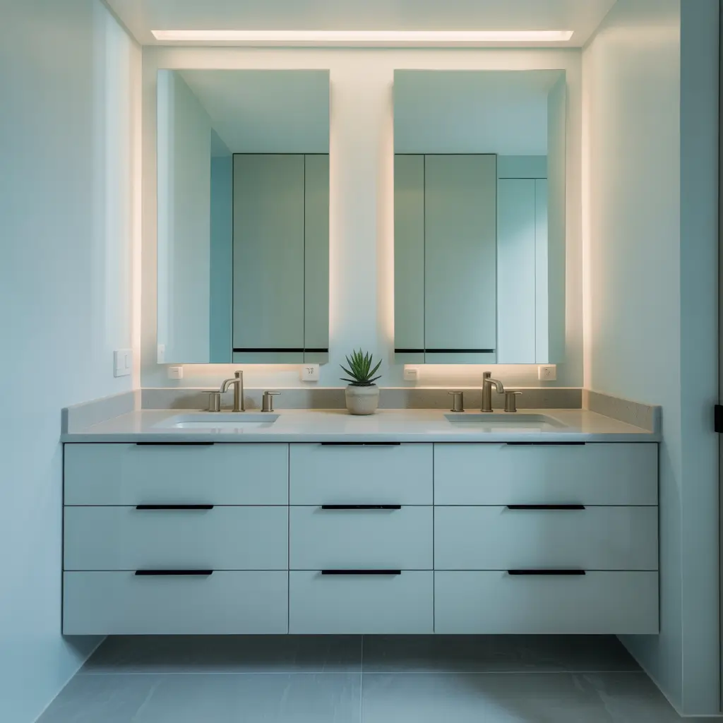 - LED strips under floating vanities for a floating effect