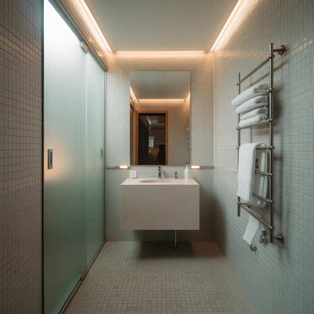 Can we talk about how much space traditional doors waste? A standard door swing eats up 9 square feet of floor space. In a small bathroom, that’s huge! Enter the sliding door – your new best friend.