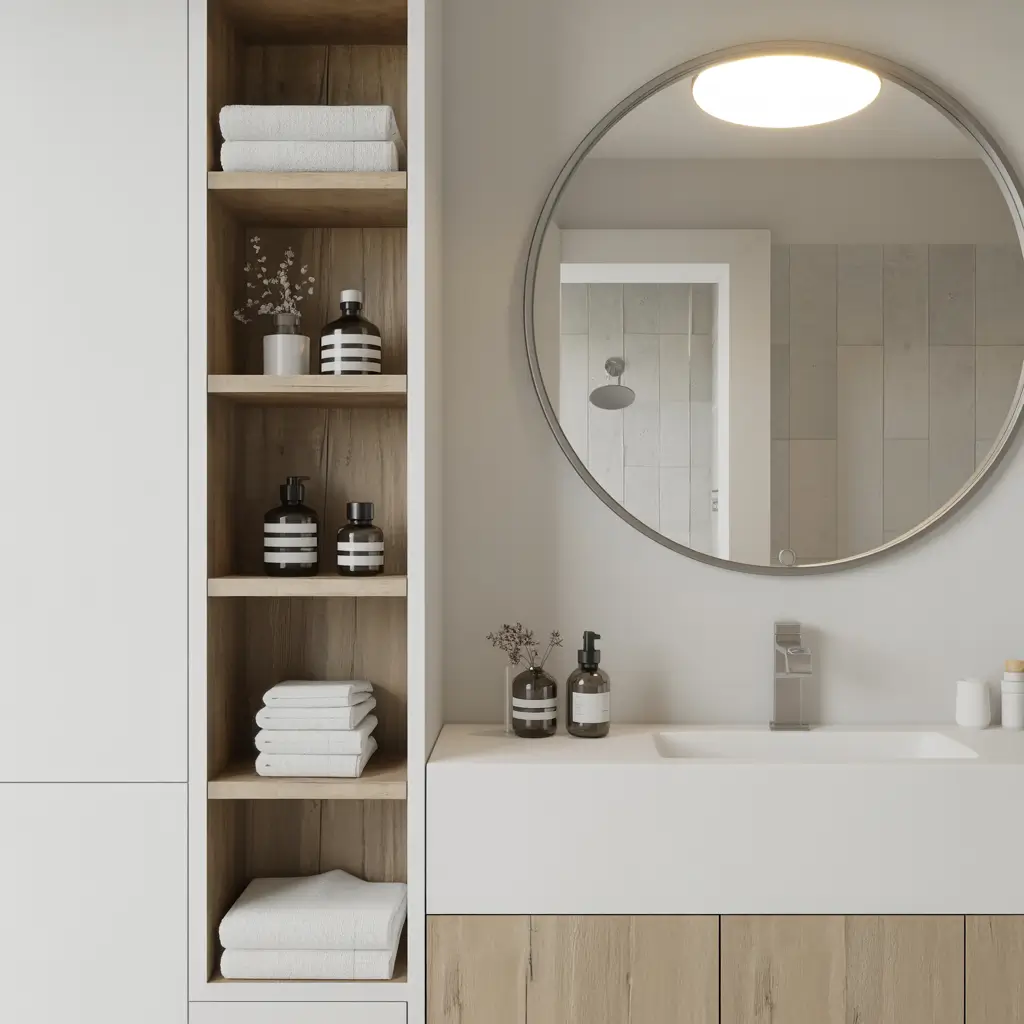 Speaking of open shelving – this trend isn’t going anywhere, and for good reason. Open shelf vanities give you storage without the visual weight of closed cabinets. Plus, they force you to keep things organized (blessing in disguise, really).