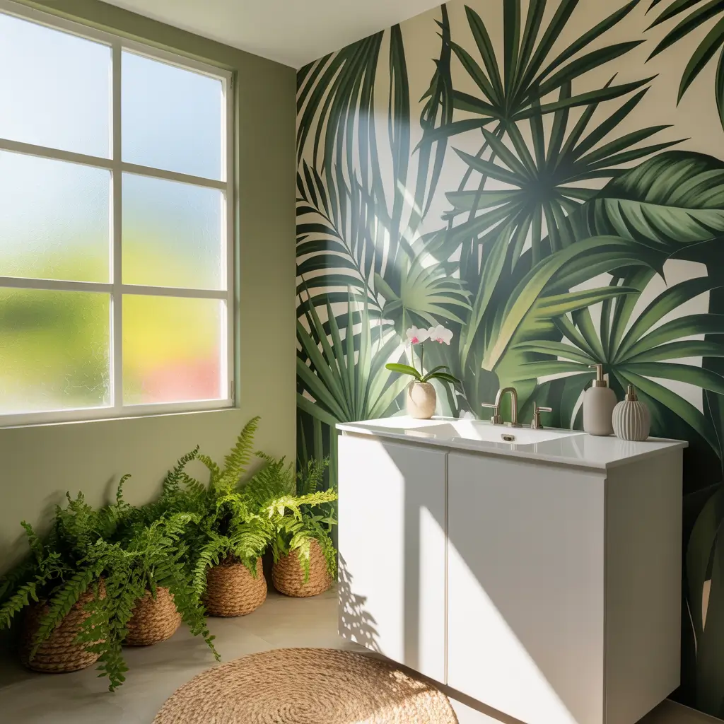 Greenery murals work because they create depth perception. Your brain interprets the layers of leaves and plants as actual space, making the room feel larger. Choose murals with a path or opening that leads the eye deeper into the scene.