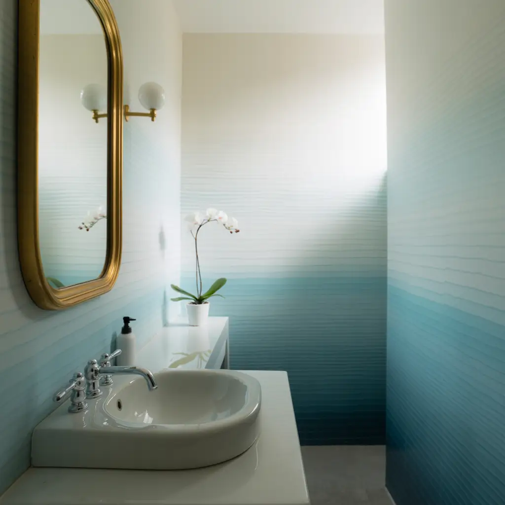 I recommend starting with a darker shade at the bottom and gradually lightening toward the ceiling. This grounds the space while creating an airy feeling up top. Blue ombre mimics the sky, while gray ombre offers a more sophisticated, modern look.