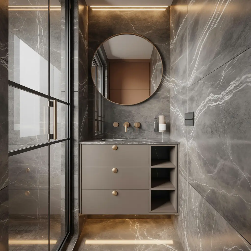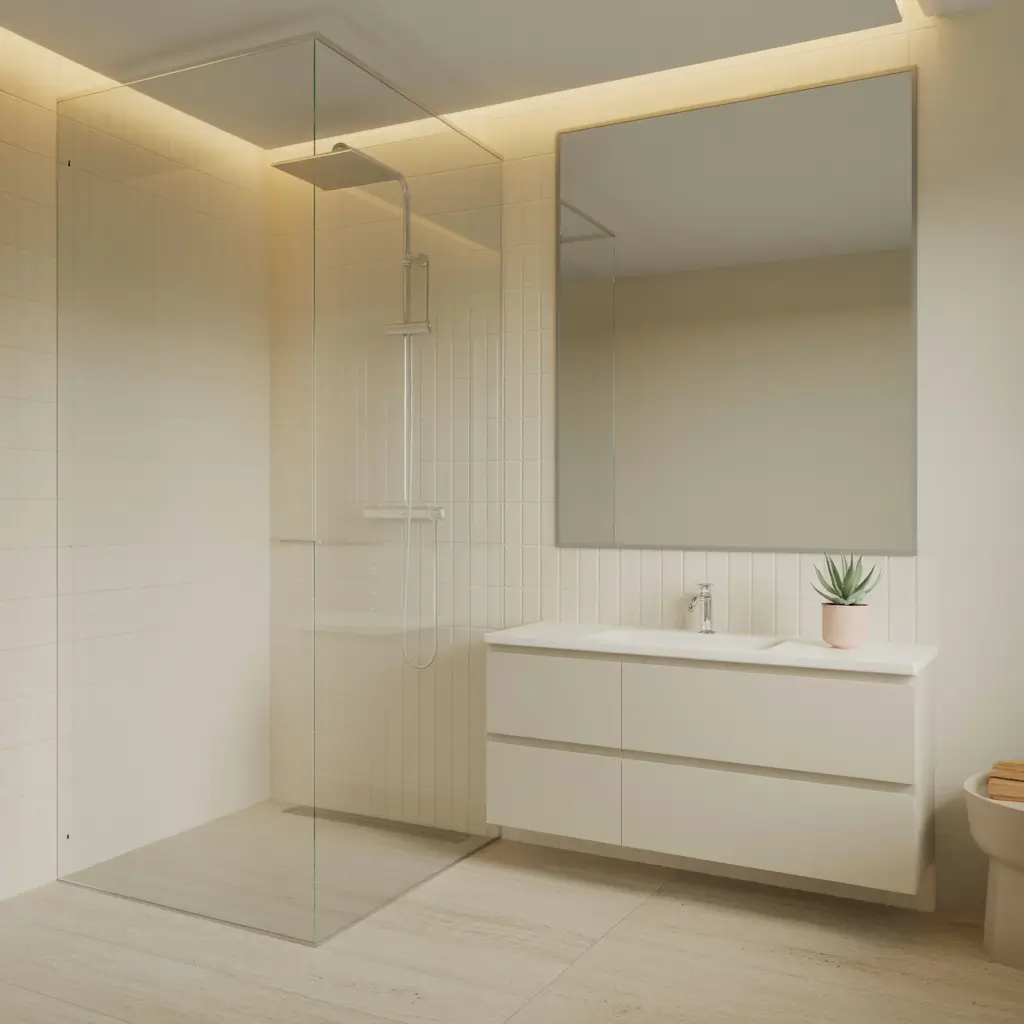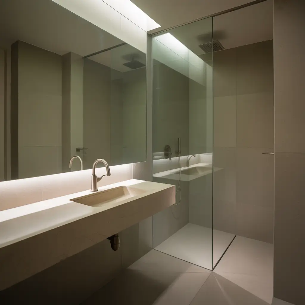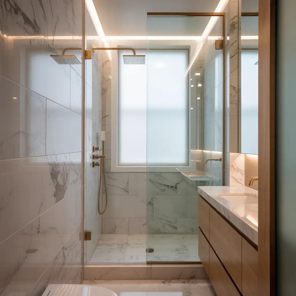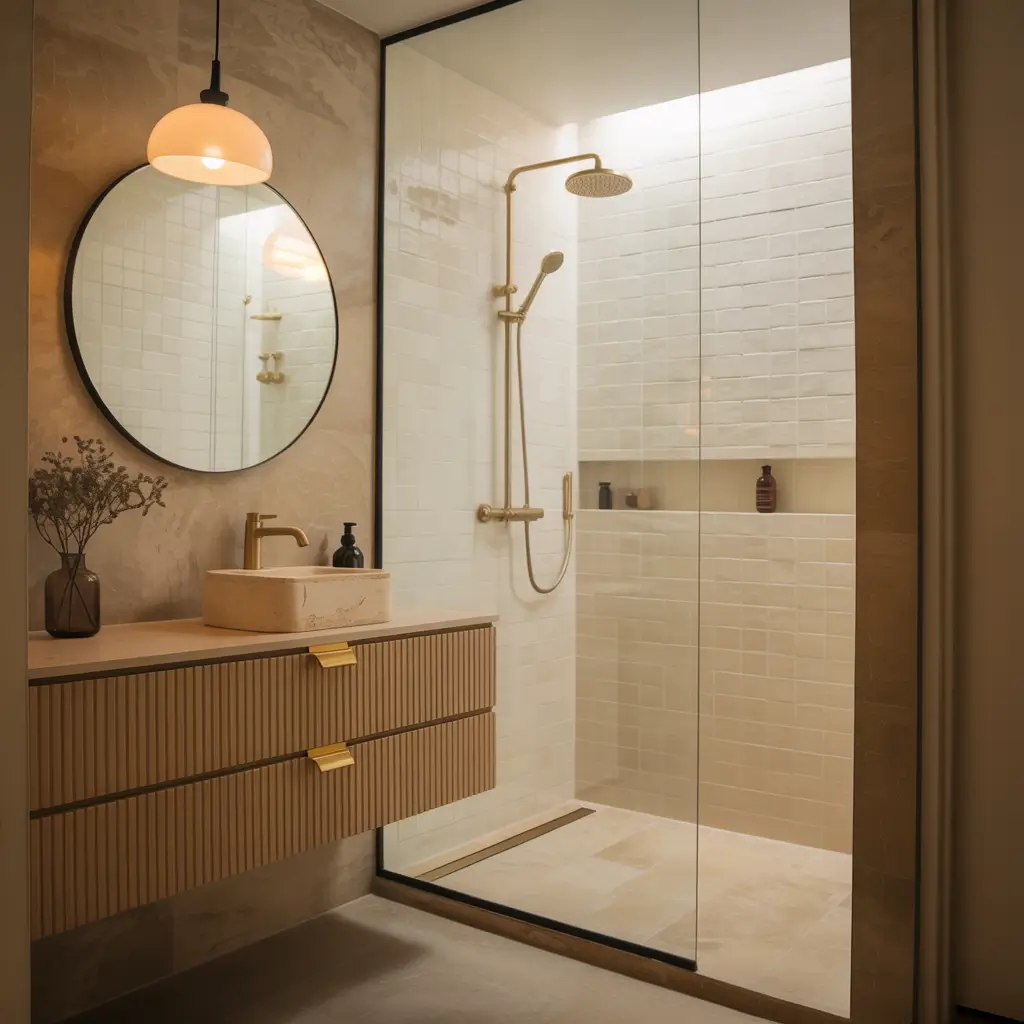 A mirrored wall opposite or adjacent to your shower doubles your visual space instantly. This classic trick never gets old because it works every single time.