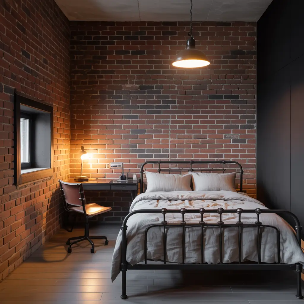 The minimalist industrial small bedroom kills two birds with one stone—it embraces the “less is more” philosophy while adding raw, masculine edge. Small spaces actually benefit from industrial style because exposed elements create visual interest without taking up floor space.