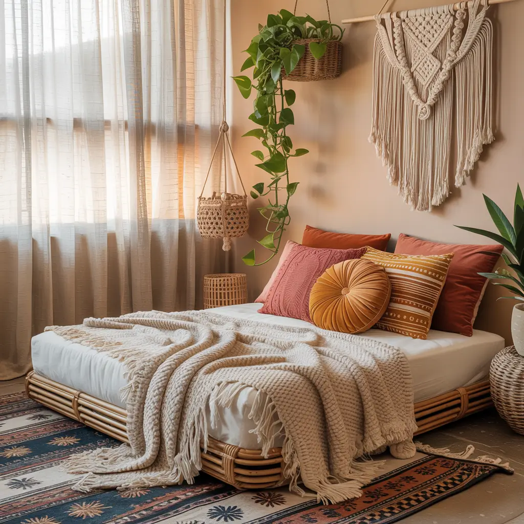 Layer textiles on the bed, not everywhere. The bed becomes the boho focal point with layered rugs as a headboard, multiple throw pillows, and various blankets. Everything else stays relatively simple, preventing sensory overload.