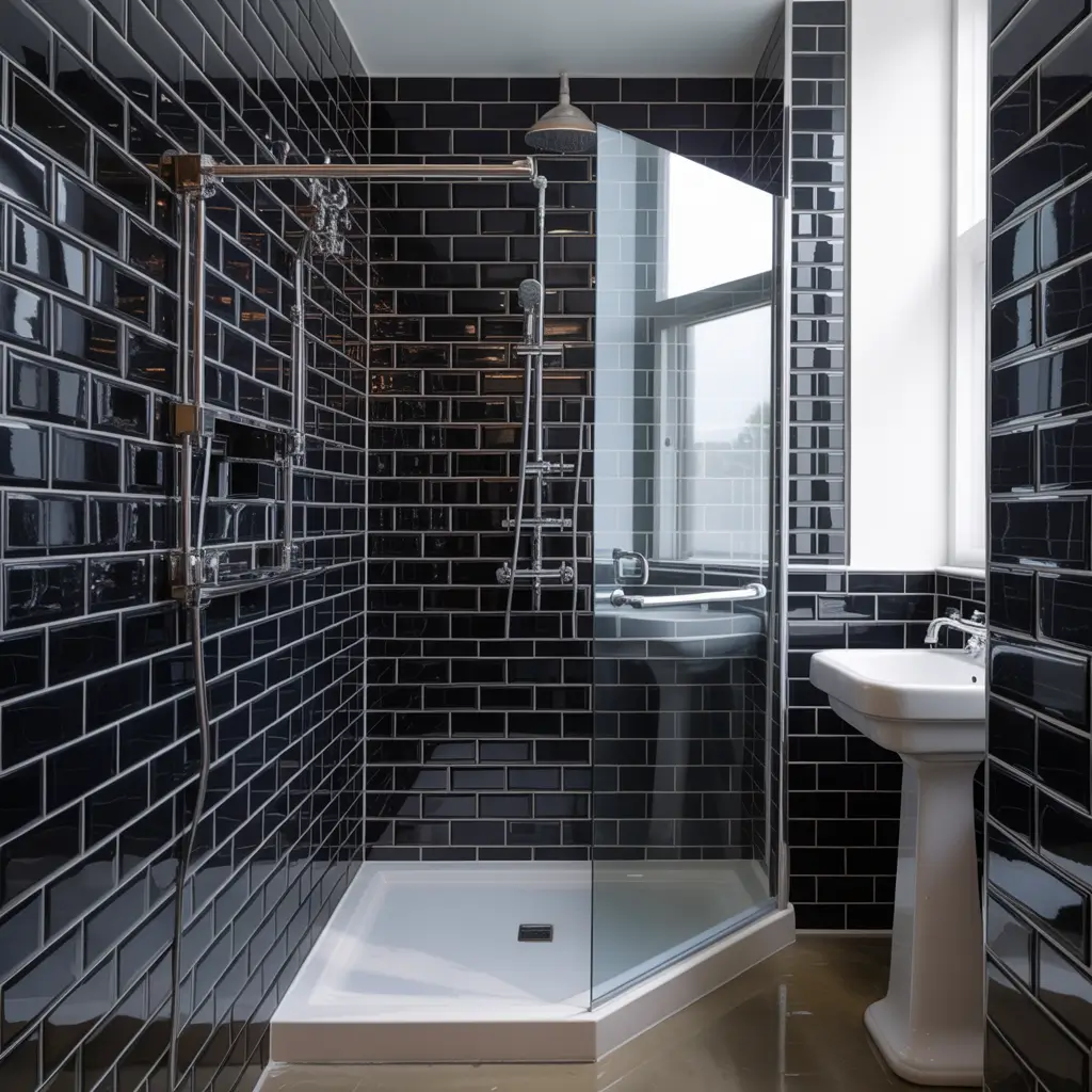 Subway tiles in black? Chef’s kiss. They give you that classic pattern everyone loves but with a modern twist that feels fresh and current. Plus, they’re practically indestructible and hide soap scum like champions.