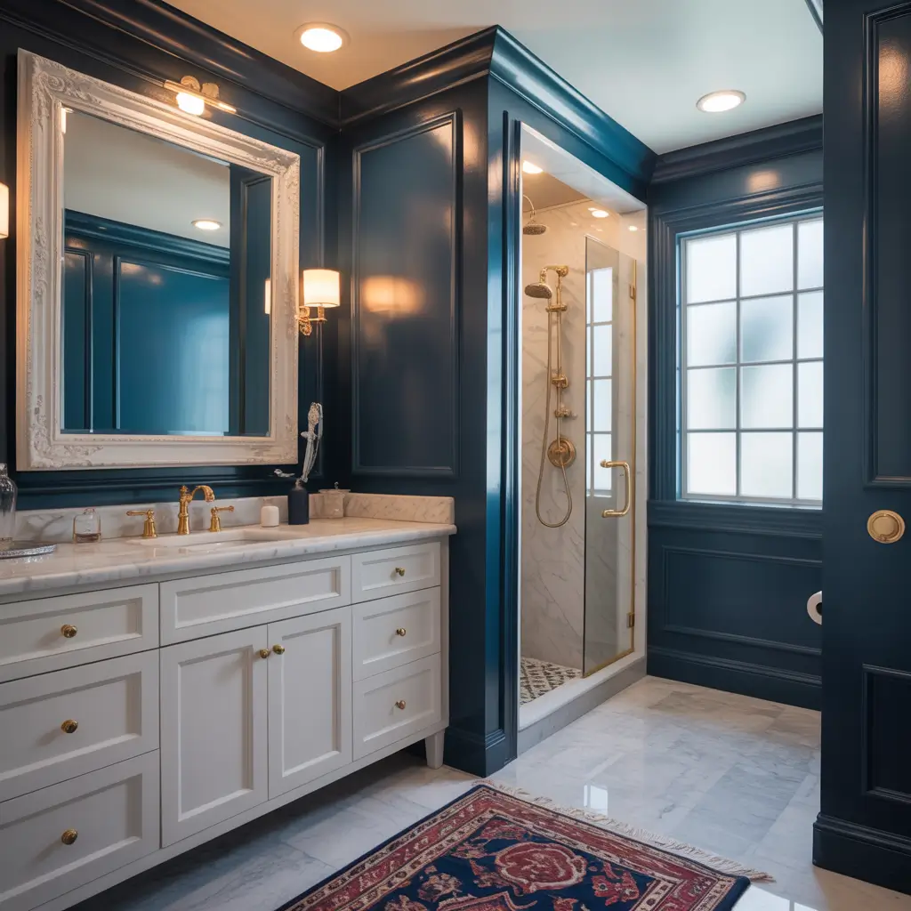 The trick with navy in small spaces? Use it strategically. Paint one accent wall navy – preferably the one behind your vanity – and keep everything else pristine white. This creates depth without making the room feel like a cave. Navy tiles on the floor with white walls work amazingly well too.