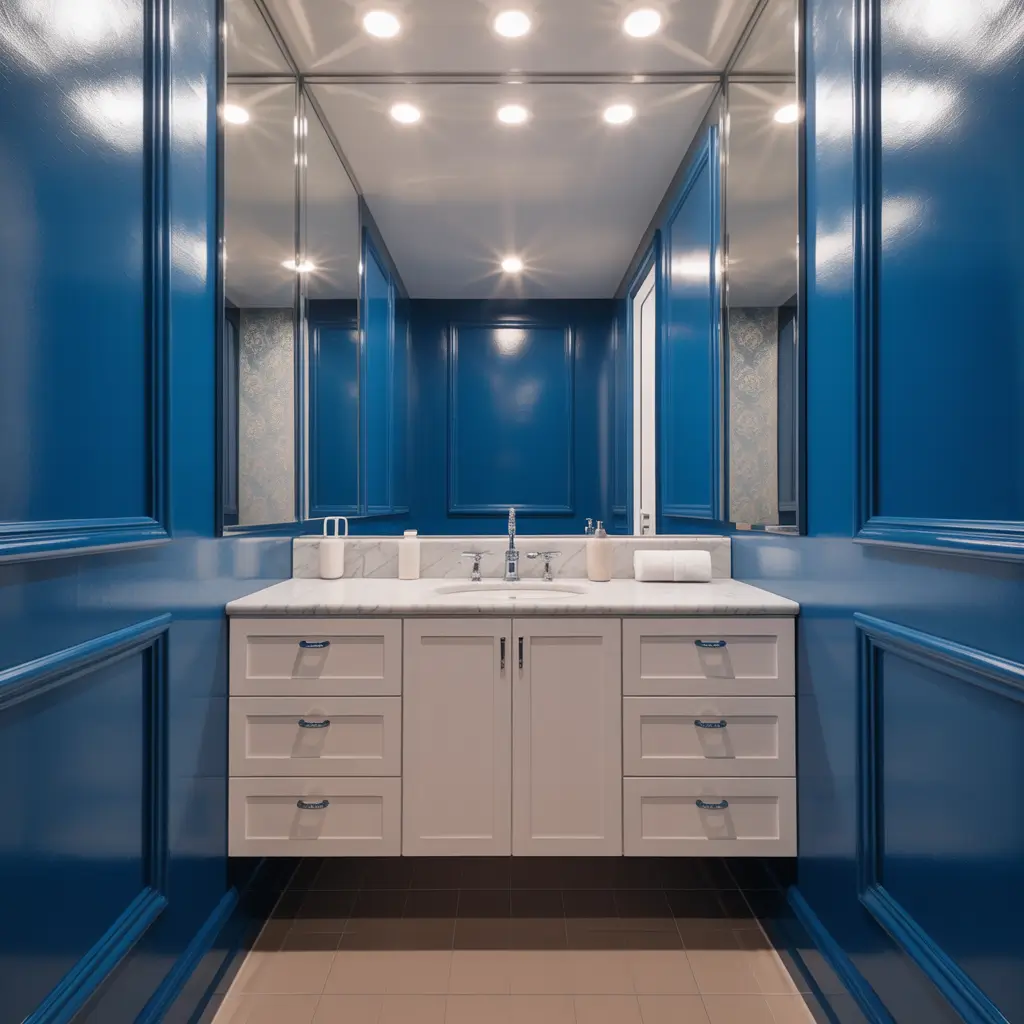Mirrors are the oldest trick in the small-space playbook, but combine them with royal blue and something magical happens. The deep blue reflects differently than lighter colors, creating depth instead of just brightness.