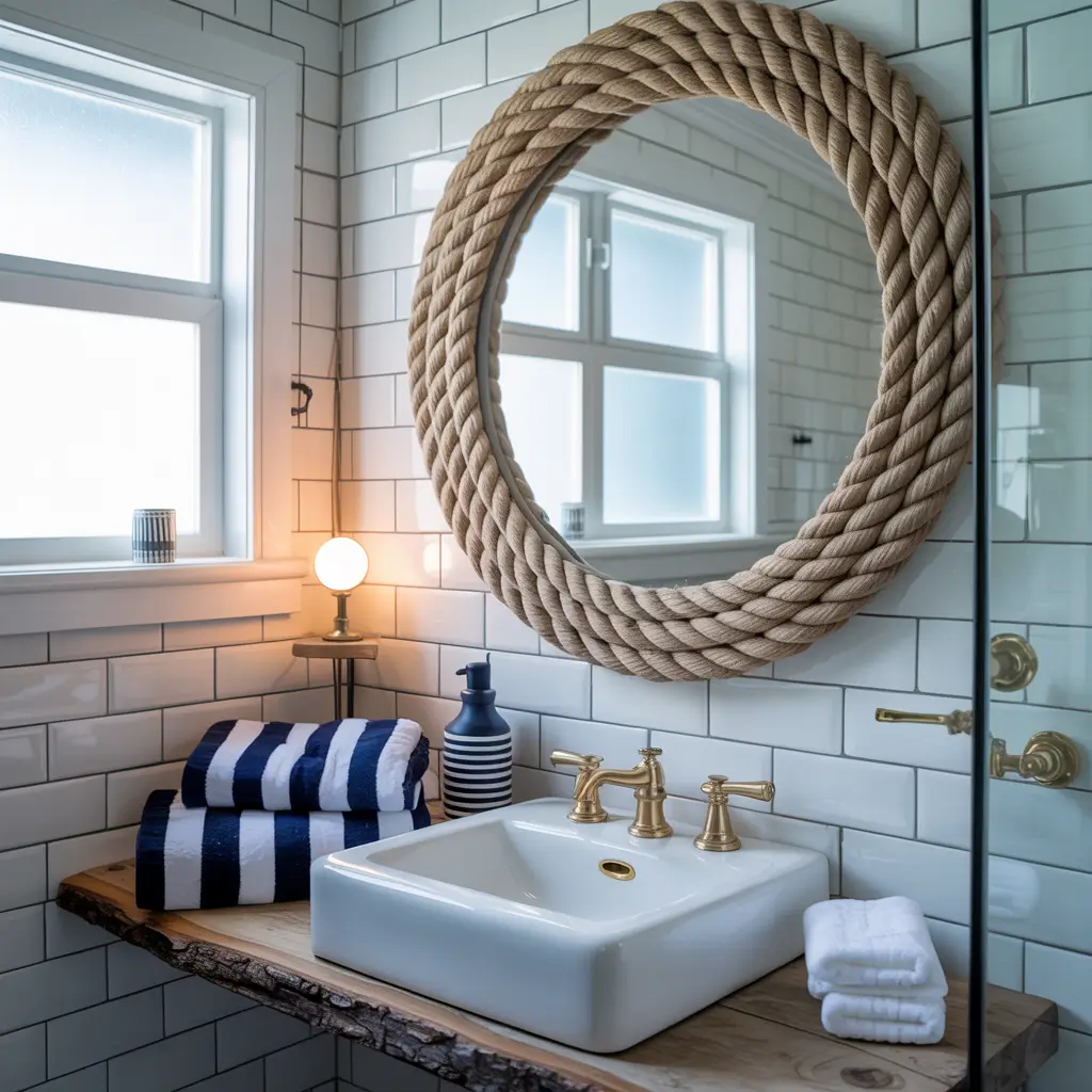Want to know what really sells the nautical look? Strategic pattern placement. Use stripes on one accent wall or in your shower curtain, not everywhere. Add solid navy towels and white fixtures. Throw in some rope details on mirrors or shelving, and boom – instant coastal captain vibes.